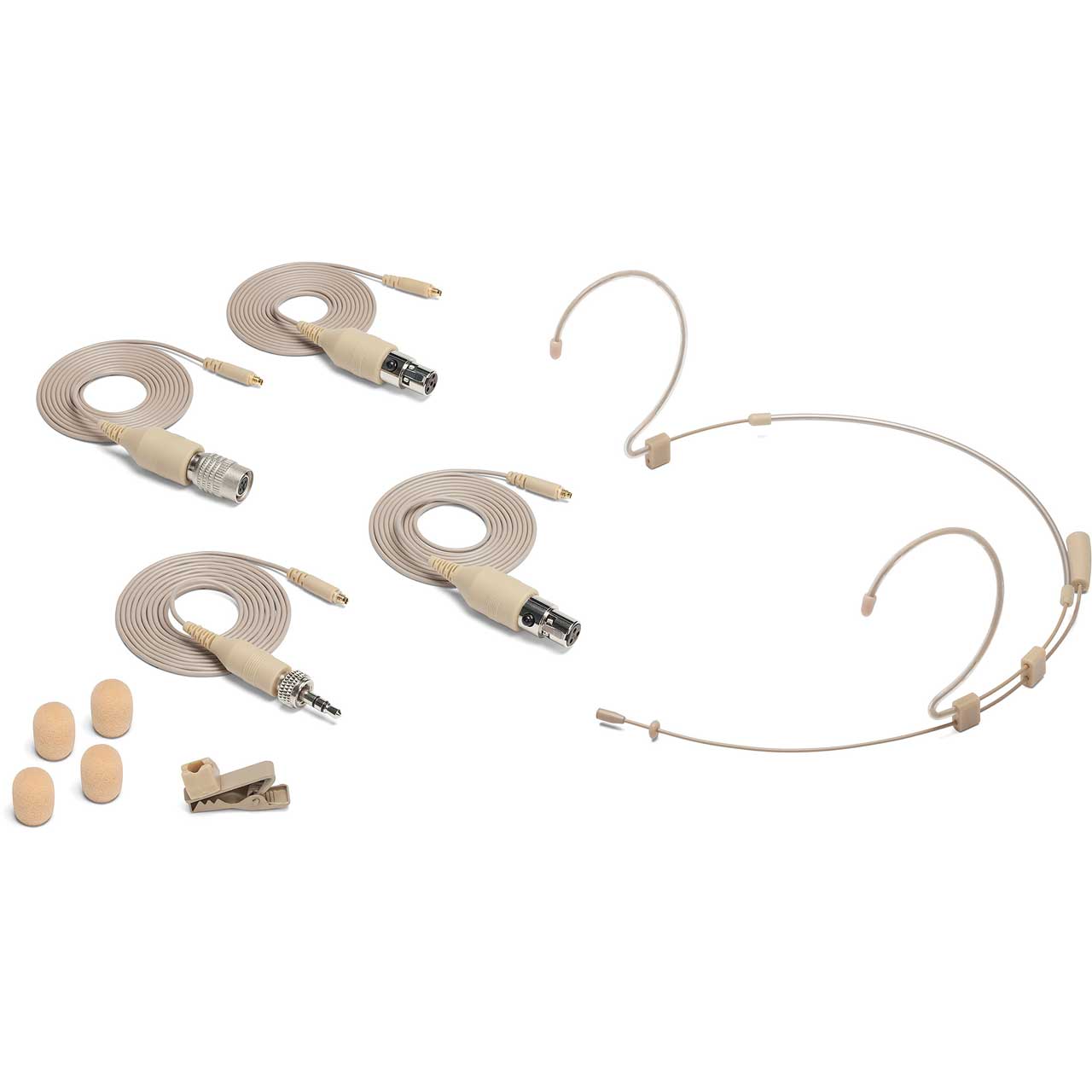 The DE50x comes with four detachable microphone cables with 1/8" (3.5mm), Hirose® 4-Pin, Switchcraft® TA3F and Switchcraft® TA4F adapters respectively. This makes the DE50x well suited for use with Samson wireless systems (TA3F), as well as most other popular wireless systems. The DE50x is also bundled with four windscreens for reducing wind noise and P-pops, a collar clip for unobtrusive wire placement and a protective carry case.