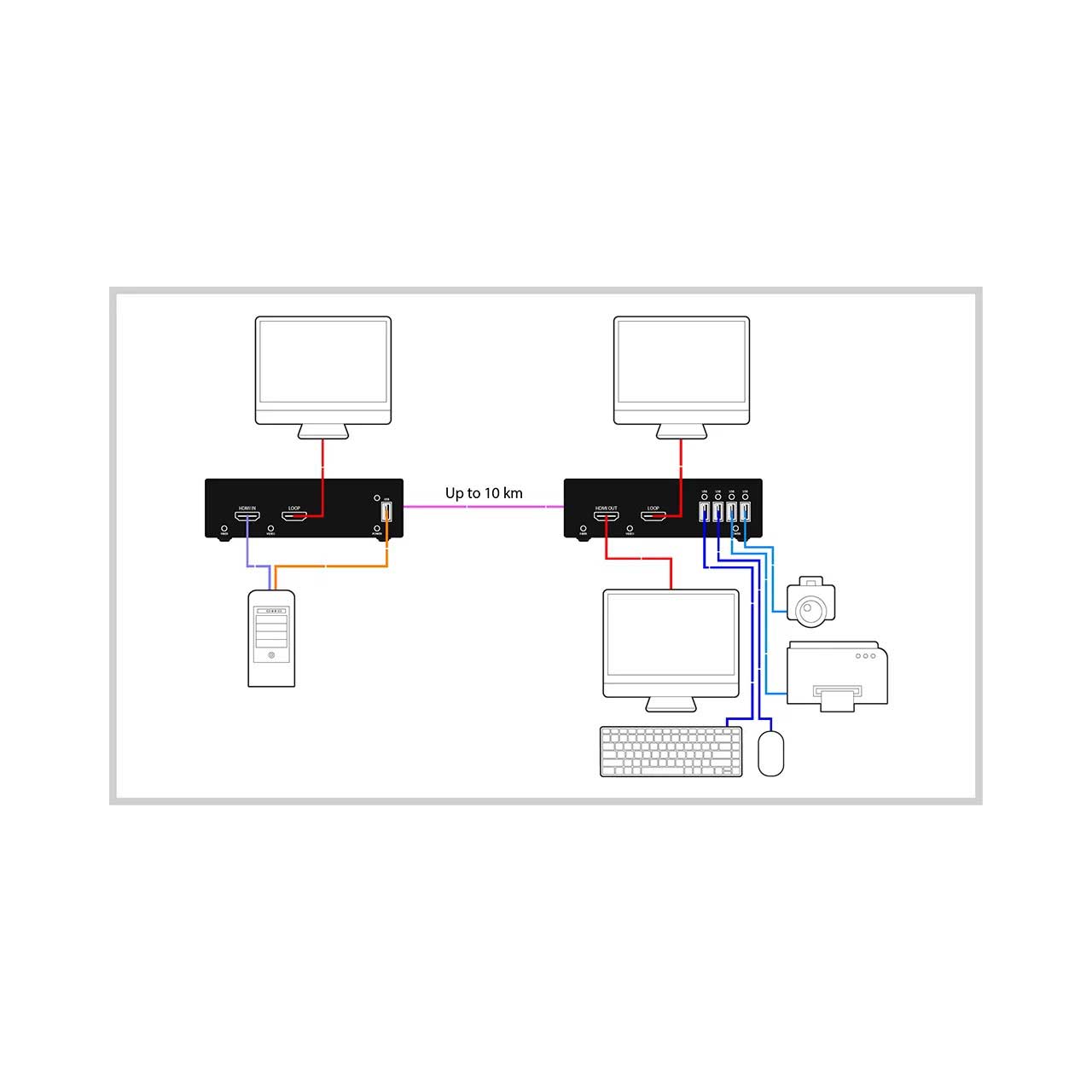 The Smart-AVI HFX-UX-TX is a Single Head HDMI 2.0 (3840 x 2160), USB 2.0, USB keyboard-mouse, sending signals up to 10 km (6.2 miles) away over a single conventional and inexpensive single fiber cable. This new technology is superior to older HDMI extenders that require a special single fiber shielded cable to go a short distance.