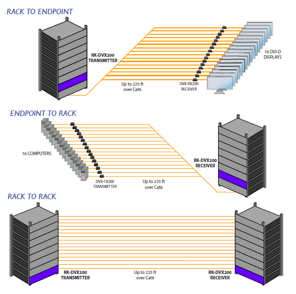 The RK-DVX200 series is the ideal solution for extending DVI-D signals to remote locations up to 225 feet away. It is the ideal way to extend up to 16 workstation computers from one location to another location or various locations. It is fully compatible with Mac, PC and Linux standards. Up to 16 displays can be extended easily from a rack without the complication or expense of multiple extenders. Rather than buy multiple extenders for rack components, and having to find power strips or numerous power outlets for the adapters, the SmartAVI rack series of extenders allows for up to 16 inputs and 16 outputs from a single rack device. The extender comes in three configurations: four inputs and four outputs, eight inputs and eight outputs, and 16 inputs and 16 outputs. The extender can achieve the full output distance of 225 feet when using a Cat6 23AWG STP cable.