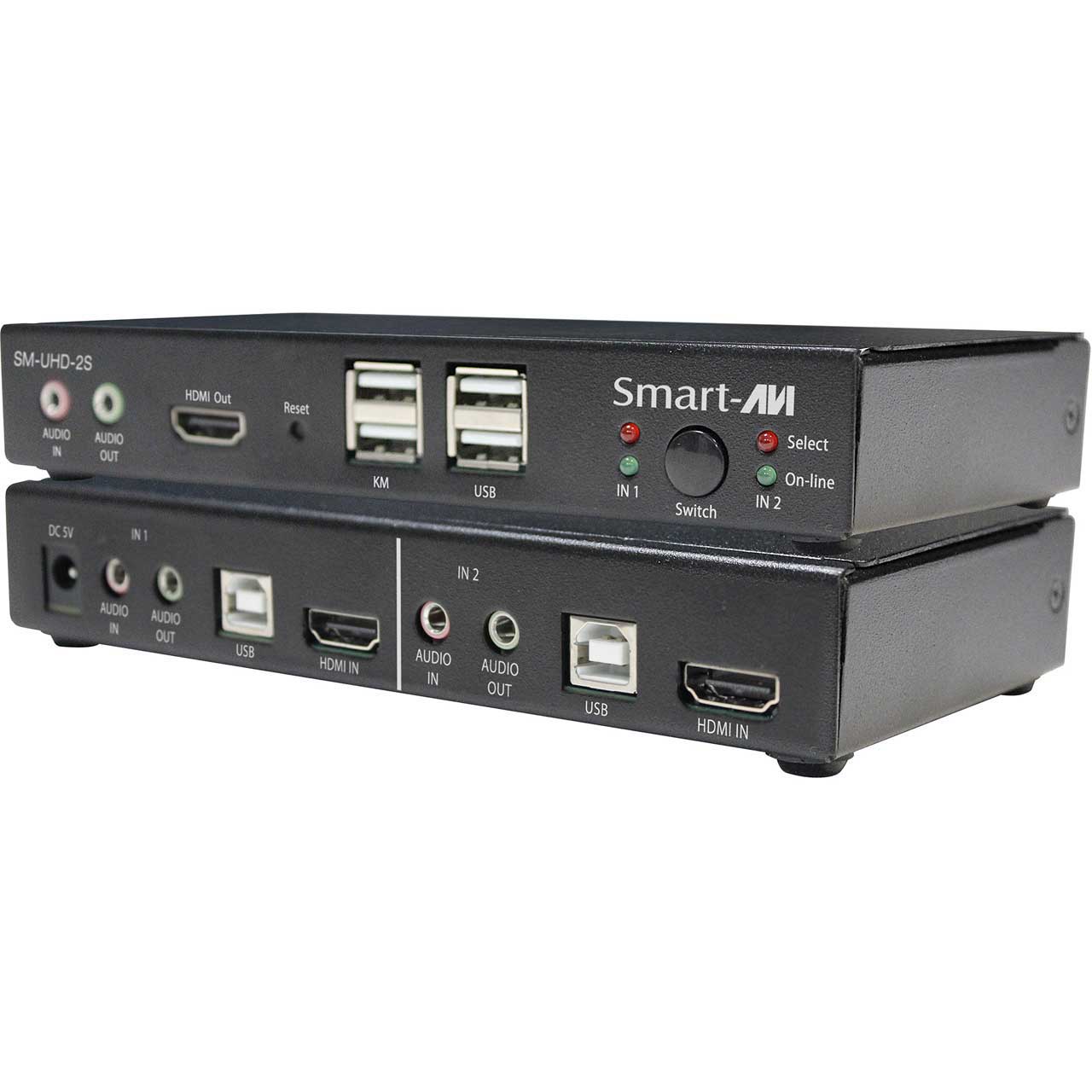 The SM-UHD-2S KVM Switch allows the control of two computers with 4K single HDMI video output via a single console set of USB keyboard/mouse/hub, microphone, speaker and display. The SM-UHD-2S KVM Switch has built-in USB 2.0 compliant and 3.5mm mini stereo ports allow sharing of the USB keyboard/ mouse/hub, speaker, and microphone among the connected computers. The switching between the connected computers is executed by using the front panel or keyboard hotkey commands. Product set-up is quick and simple with no software to install, so you're ready to go right out of the box.