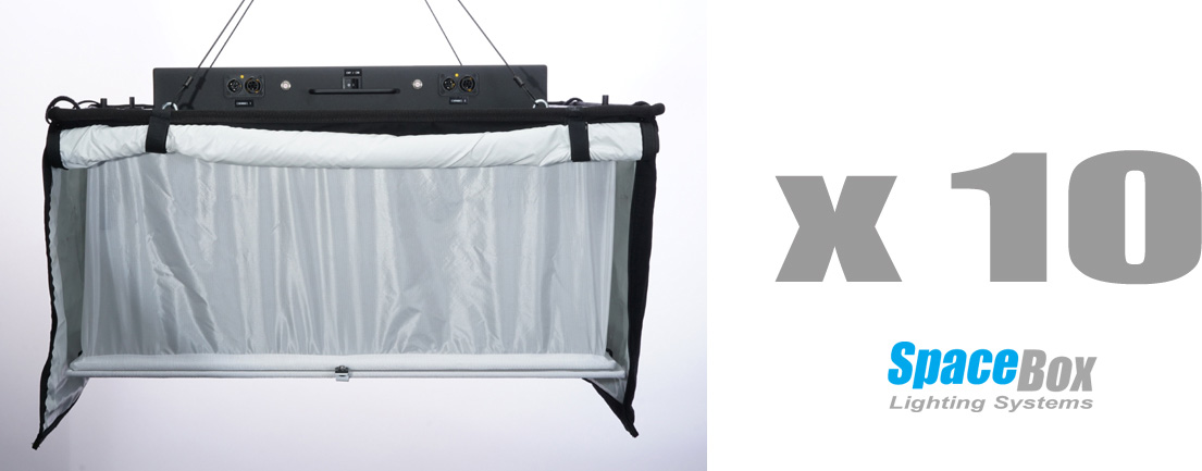 The SpaceBox SBLED-STKT10-120-B LED Studio Ten Kit makes setting up a complete studio lighting system easy, right out of the box. If you have a grid or even just simple rigging points in your studio space, the Studio Four Kit will provide your lighting base coat for a room size of 25' x 35' or 30' x 30'.