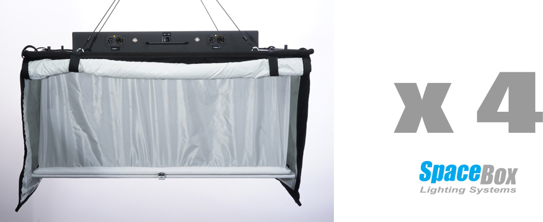 The SpaceBox SBLED-STKT4-120-D LED Studio Four Kit makes setting up a complete studio lighting system easy, right out of the box. If you have a grid or even just simple rigging points in your studio space, the Studio Four Kit will provide your lighting base coat for a room size of 10' x 10' to a 15' x 15'.