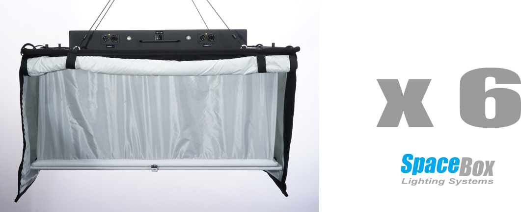 The SpaceBox SBLED-STKT6-220-D LED Studio Six Kit makes setting up a complete studio lighting system easy, right out of the box. If you have a grid or even just simple rigging points in your studio space, the Studio Four Kit will provide your lighting base coat for a room size of 15' x 30'.