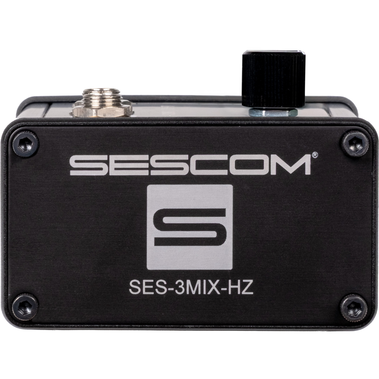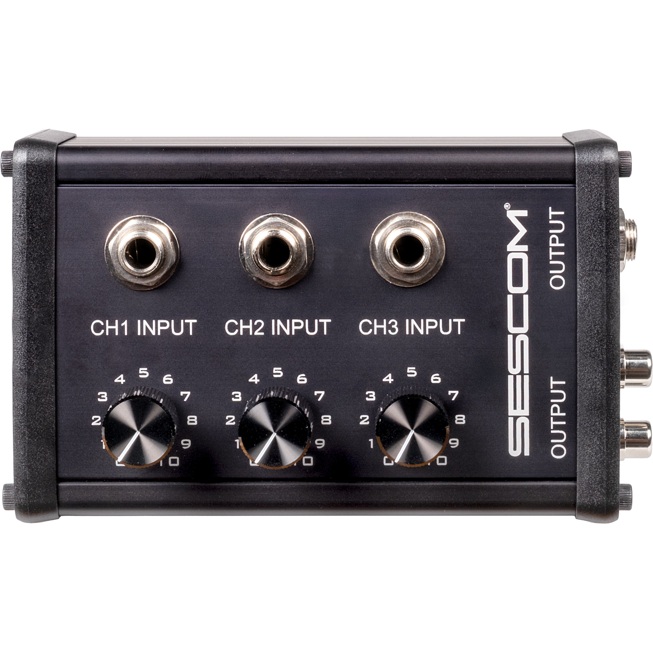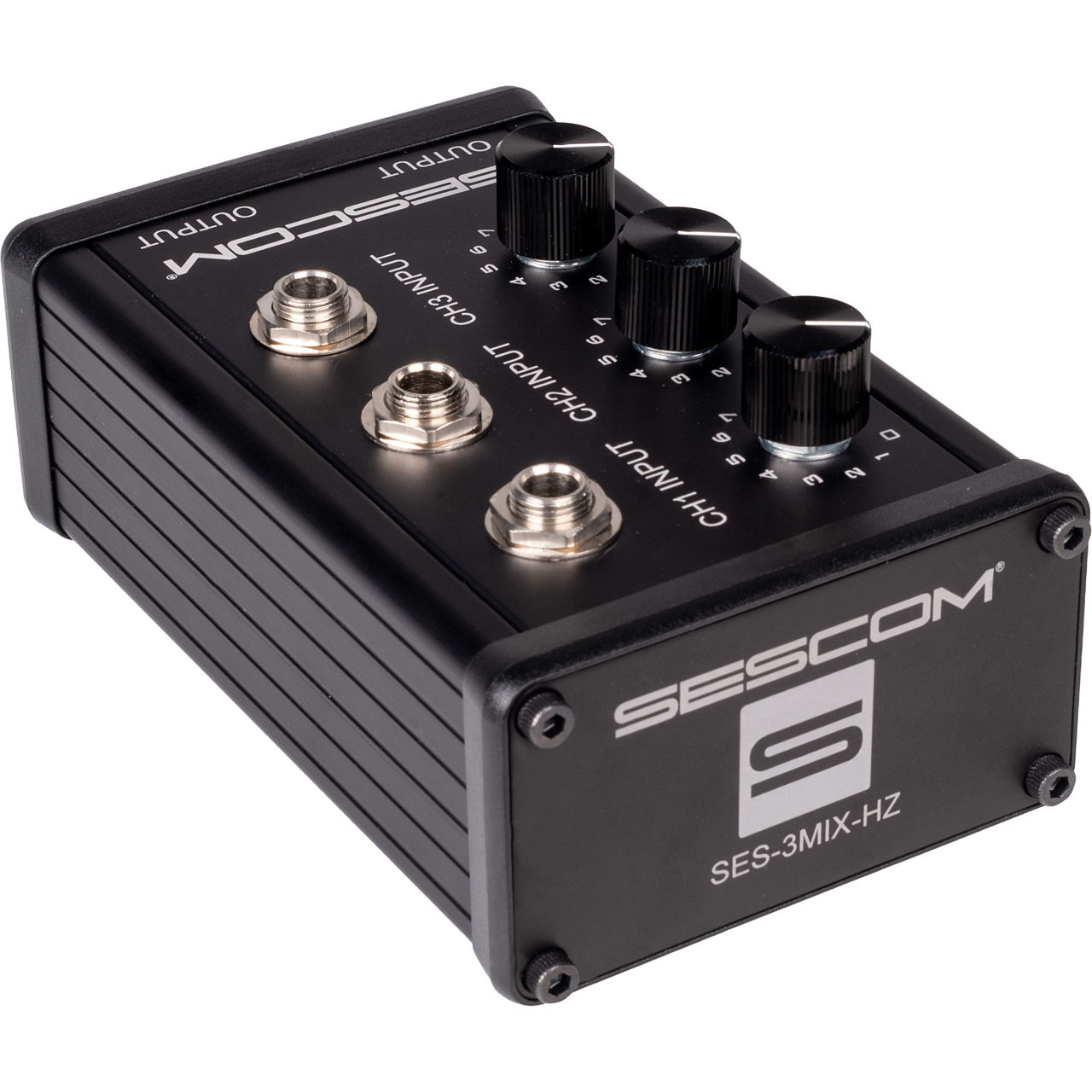 The Sescom 3MIX-HZ has 3 TRS 1/4-inch inputs, and each input has its own independent level control. The 3MIX-HZ features 1/4-inch TRS and left/right RCA outputs, which can send audio simultaneously, and is housed in a rugged anodized aluminum box suitable for use in the studio or on stage.