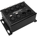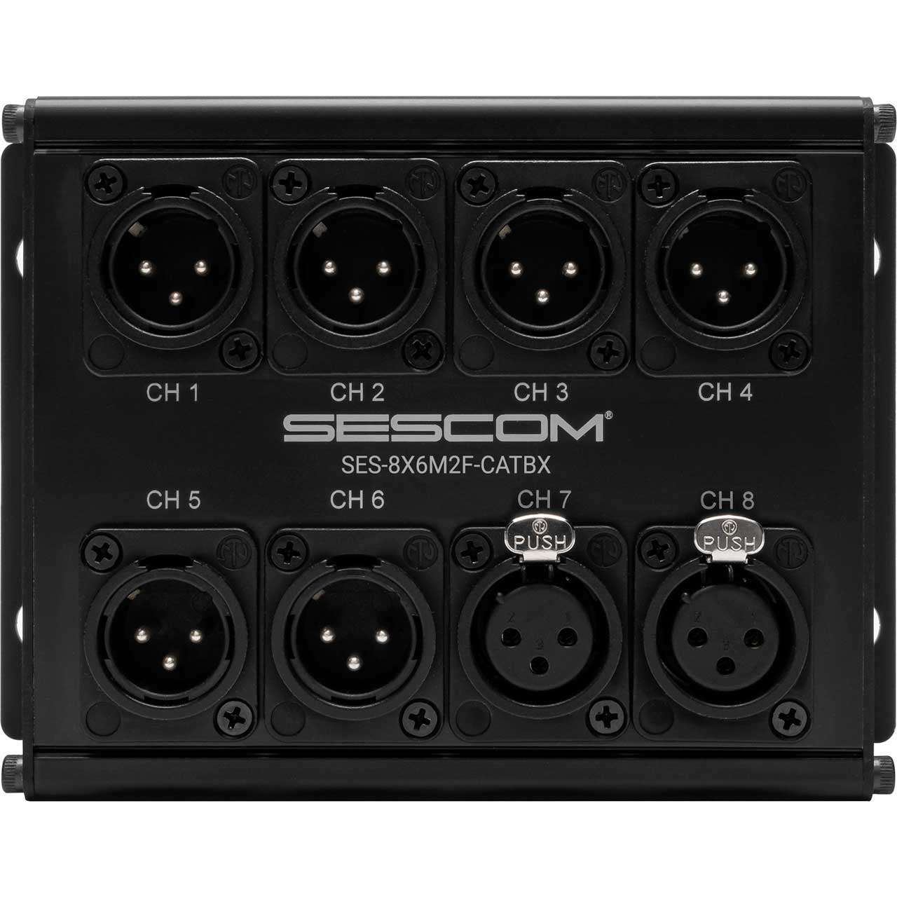 Save big on the costs of expensive XLR audio snakes and pair-down 8 cable channels into two (2) low profile runs with the Sescom SES-8XLRM-CATBX. This brilliantly simple stage box allows you to convert 8 XLR channels to two (2) RJ45 connections allowing balanced mic level, AES/EBU digital or DMX signals to be run over two (2) CAT5, CAT5e, CAT6 or CAT7 cables.