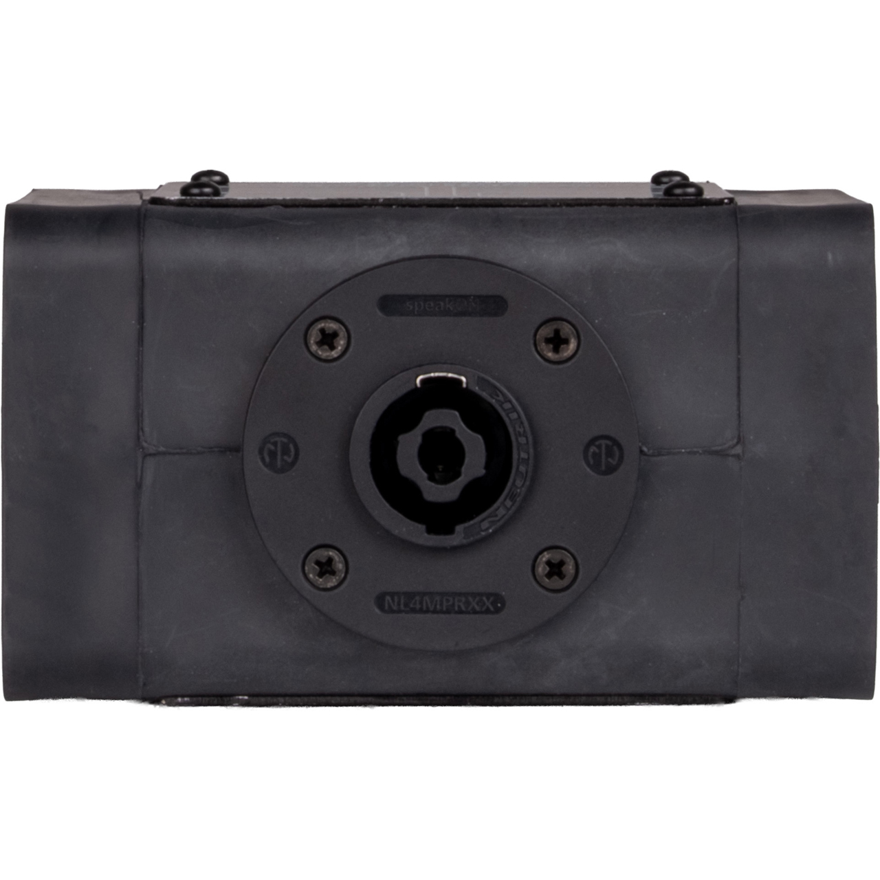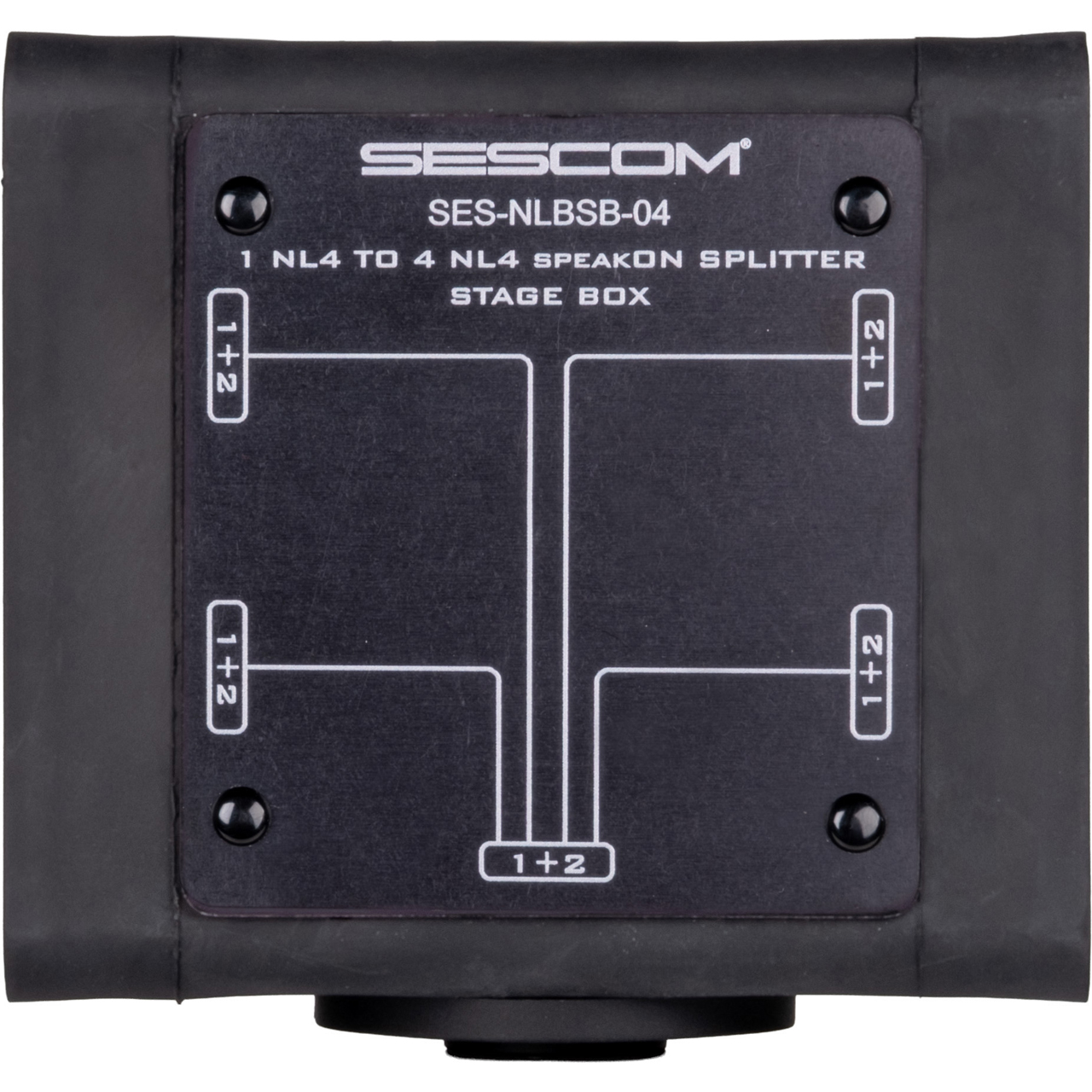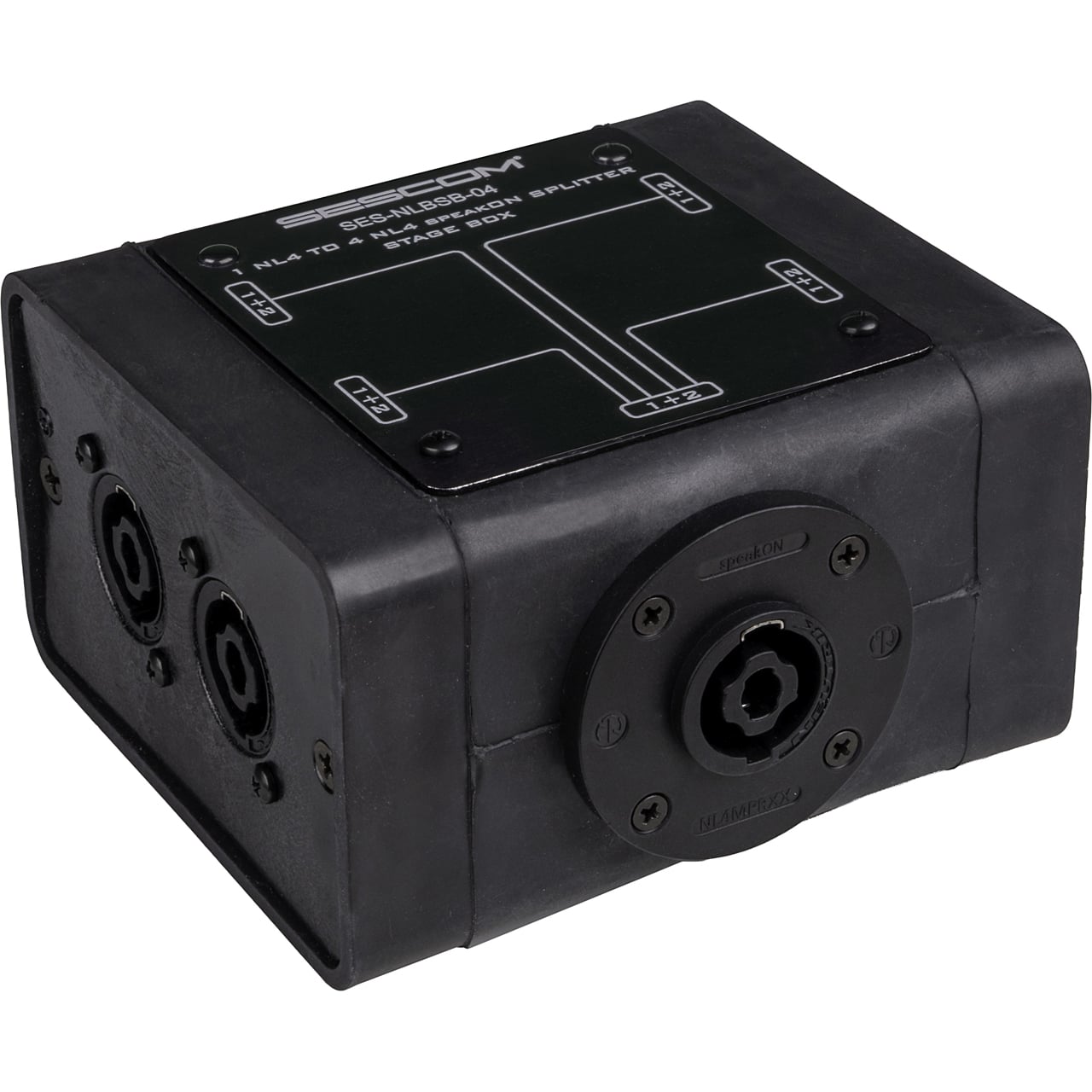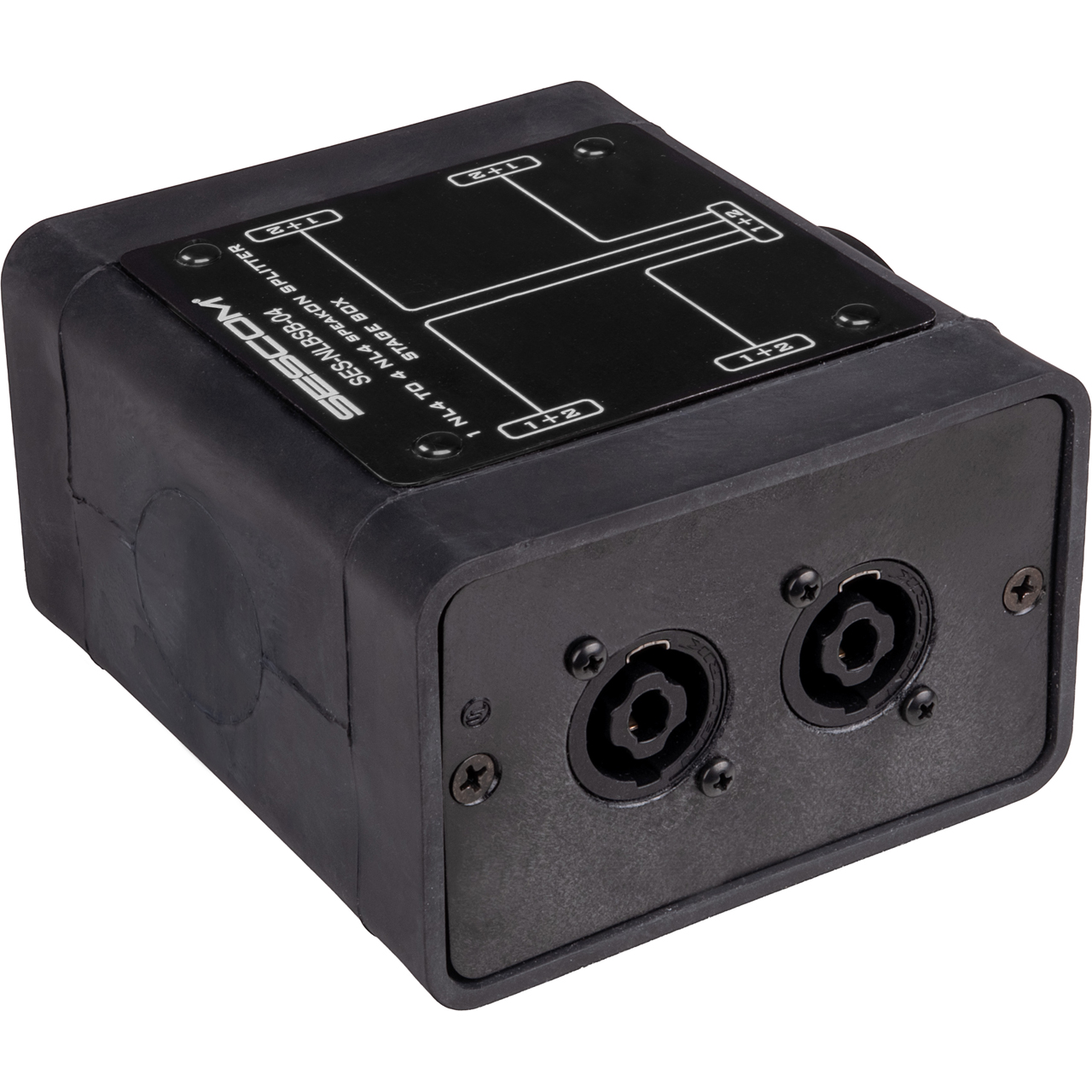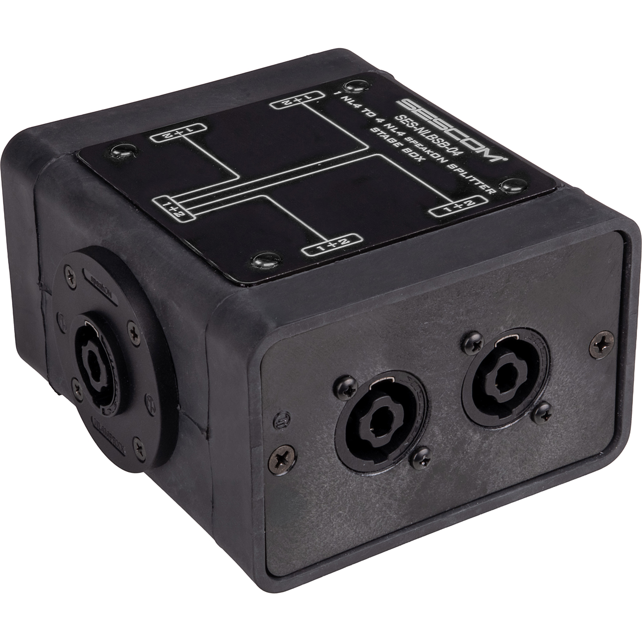 The Sescom SES-NLBSB-04 splitter stage box is a compact, rugged, rubberized 1-gang speaker signal distribution unit equipped with Neutrik speakON connectors. The 1:4 configuration features a male speakON input, which is split and/or broken out into 4 male speakON chassis connectors, enabling simple yet versatile signal distribution.