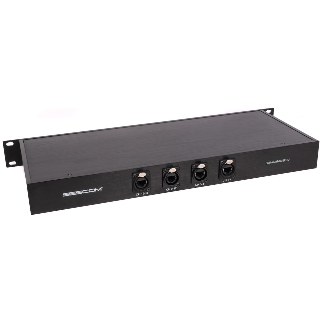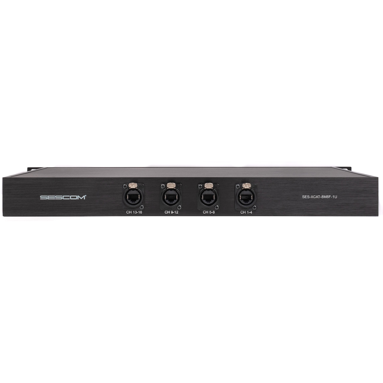 The Sescom XCAT-8M8F is a rackmountable breakout box for adapting up to 8 Female XLR and 8 Male (3-pin) channels over four Neutrik etherCON RJ45 jacks allowing users to simplify audio routing by replacing bulky snakes with compact, efficient Cat runs.