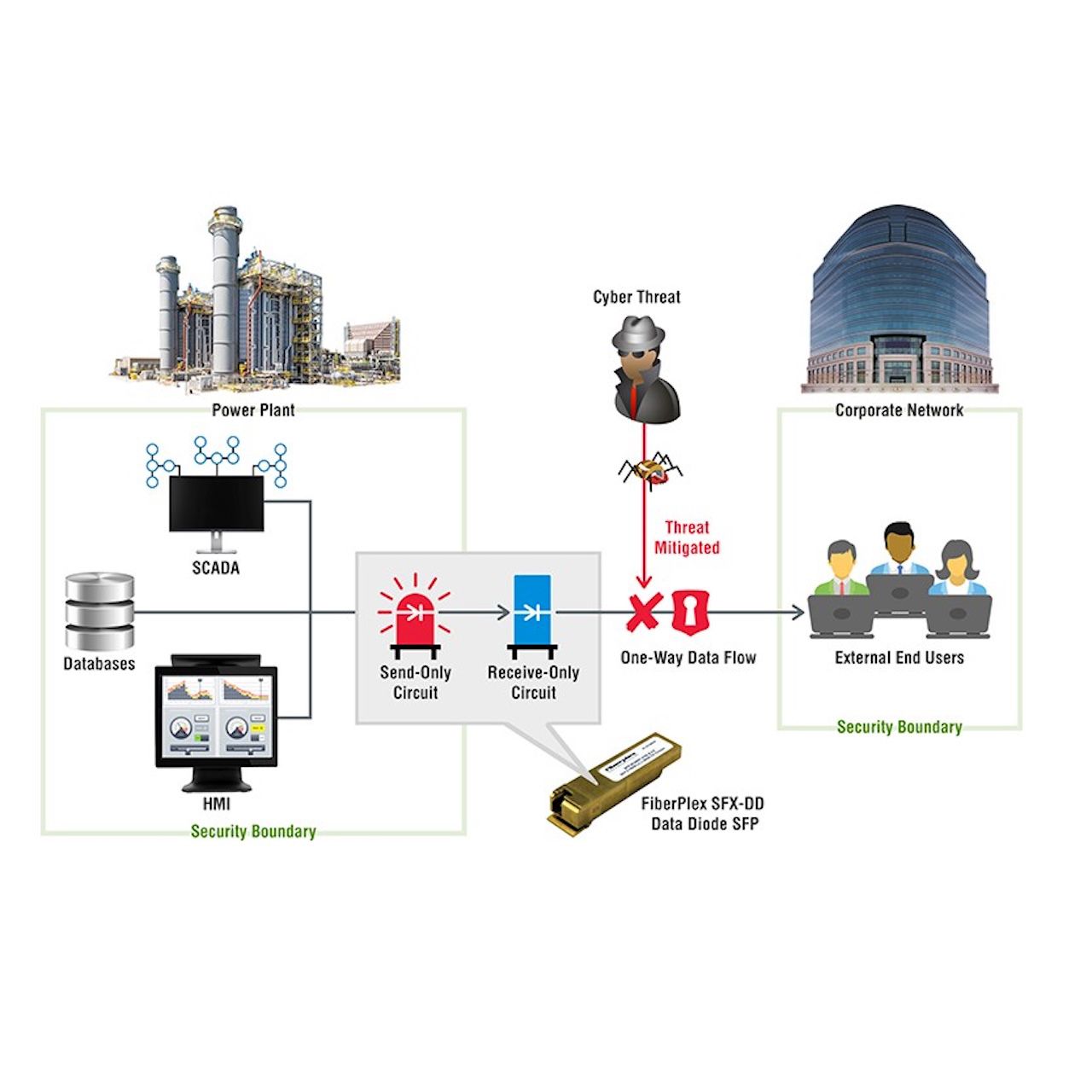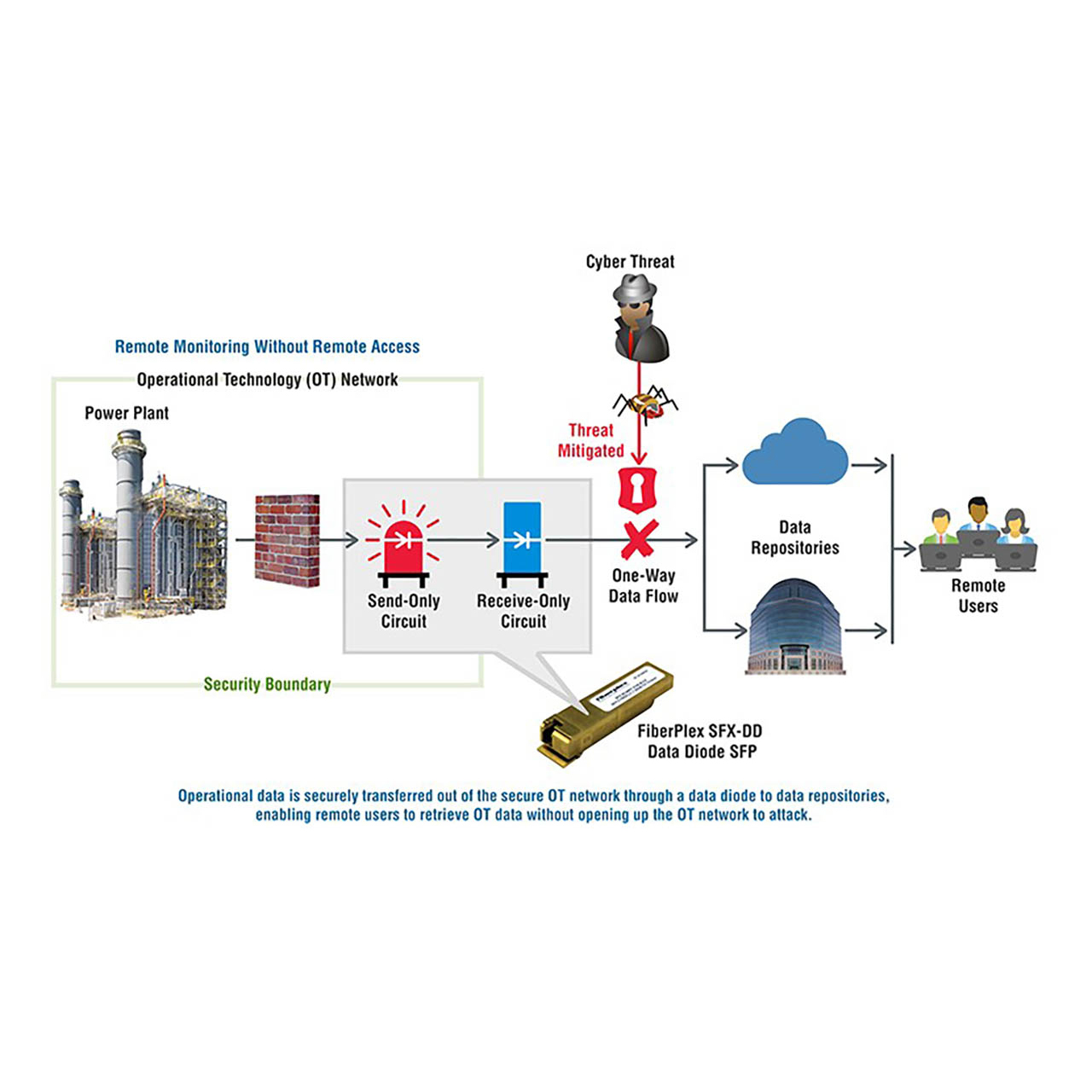 Many believe that remote monitoring cannot be achieved without remote access to systems. However, as previously stated, if remote access is provided via an external two-way connection, then a threat vector is created. By utilizing data diodes, a high-security network, such as an oil and gas refinery, is secured by one-way transfer hardware, preventing all external access. Meanwhile the data required for remote monitoring, backup, or analysis is sent one-way to another network or the cloud, where end users and applications can access it as needed without compromising the integrity of the refinery controls.