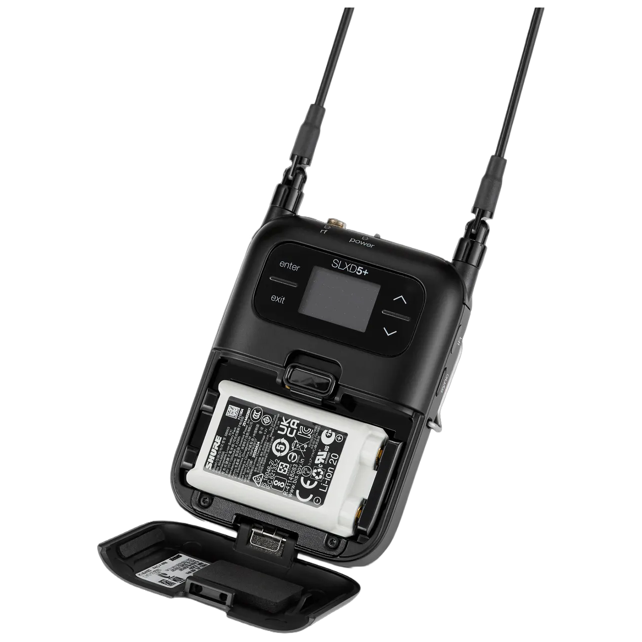 The Shure SLXD5+ Portable Wireless Receiver packs the rich features of an SLXD Digital Wireless Receiver into a slim, portable package for use with digital cameras or in audio bag applications. Featuring pristine 24-bit digital audio clarity, a wide 138 MHz tuning range and easy-to-use setup features, the SLXD5+ is at home on top of your camera or in an audio bag. With a dedicated ShowLink Ease control link, the SLXD5+ stays in sync with SLX-D+ transmitters to manage interference, scan for new channels and update for clear transmission automatically. Coordinate and monitor large channel configurations with many sources using Multi-Mic Mode. Includes SLXD5+ Portable Wireless Receiver, zippered carrying pouch, non-conductive cold shoe mount adapter, two AA alkaline batteries, 18" locking 3.5 mm-to-XLR cable, locking 3.5mm audio extender cable.