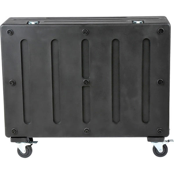 The exterior is double walled roto-molded of Linear Medium Density Polyethylene (LMDP)for maximum strength and rigidity with(4) locking casters,(6)Spring loaded handles,(8(Steel heavy-duty latches. The interior features custom foam blocks and a roto-molded hinged doghouse for management of all of the back connectors.