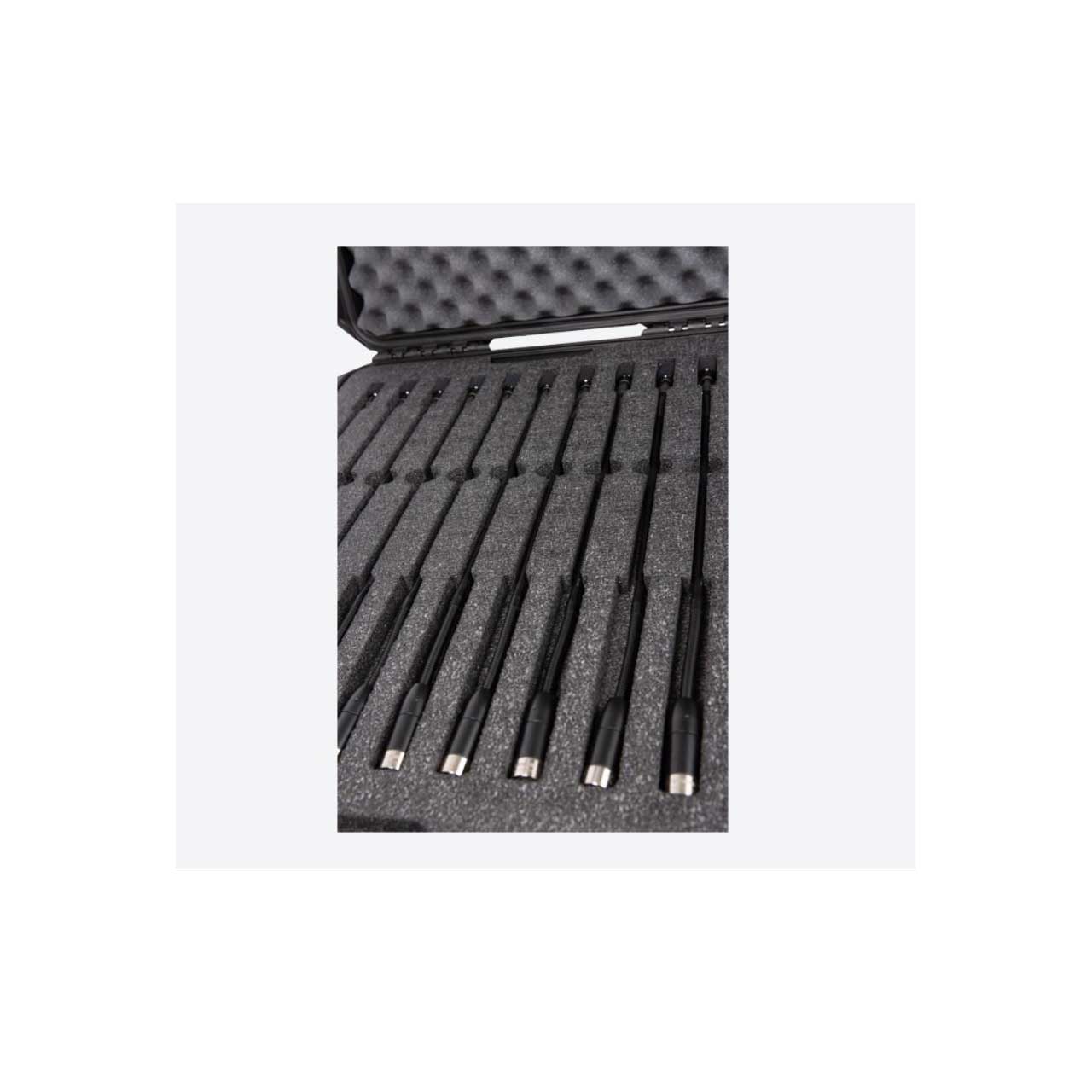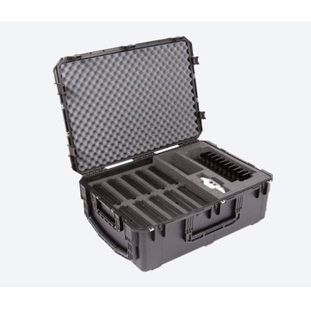 It features high quality PE foam in two layers to protect the Shure Microflex wireless system. The top layer accommodates 10 MXC420/C or MXC420DF/C microphones. The right side holds 1 MXCWAPT Access Point Transceiver and 1 MXCWNCS Network Charging Station with 10 SB930 Rechargeable batteries inside charger, and features a large pocket (11.625" x 4.75" x 9.75")for cables, power supplies, and other accessories. The bottom layer holds 10 MXCW640 wireless conference units. There is also an additional accessory pocket below the charging station that measures (14.75" x 5" x 5").