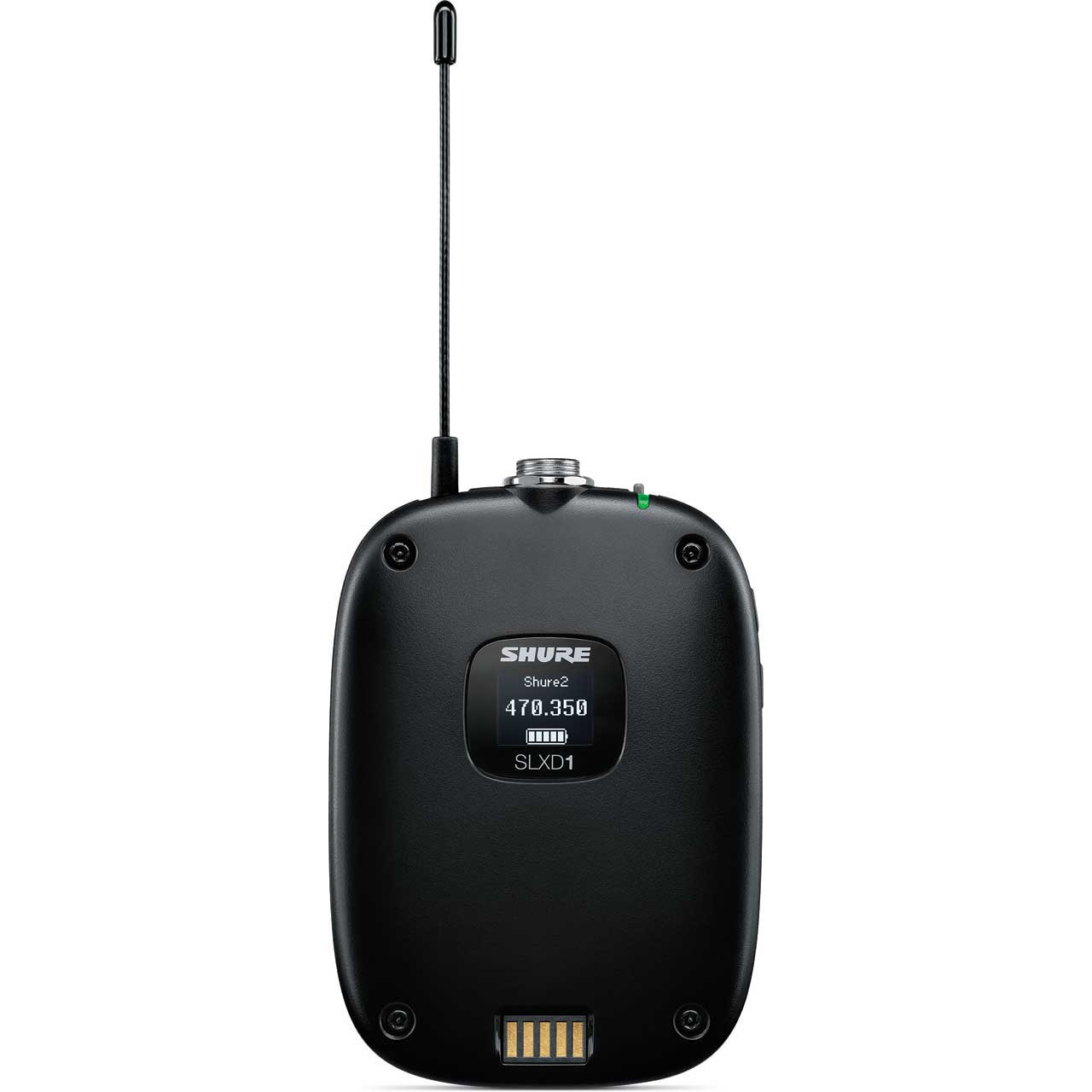 Shure SLXD transmitters have a high-contrast OLED display indicating channel name, battery status, and frequency. Both the receiver and bodypack/handheld transmitter shall be able to be locked with the options of either locking the menu only, or locking both the menu and power. The transmitter is also be able to be temporarily unlocked and automatically locked back after a certain idle time. Transmitter bodypacks use a TA4M connector as the mic connection. The bodypack and handheld are powered by two AA batteries or the SH-SB903 lithium ion rechargeable battery. The bodypack and handheld shall be able to be docked and charged on a SBC203 dual docking charger.