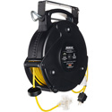 Stage Ninja STX-75-3 is a durable 14/3 power cable reel with over molded connectors for longer life. Pull cable to desired length (it locks in place); give the cable another pull to unlock. Cable instantly retracts into protective housing. The retractable cord is 75 feet 3 tap female end with locking center tap & LED light to indicate power. The static male end is 3 feet with a 10 amp on-board circuit breaker. The durable, industrial grade thermoplastic housing has integrated carrying handle and optional included swivel mounting bracket. This particular reel is drop tested at 6 feet.