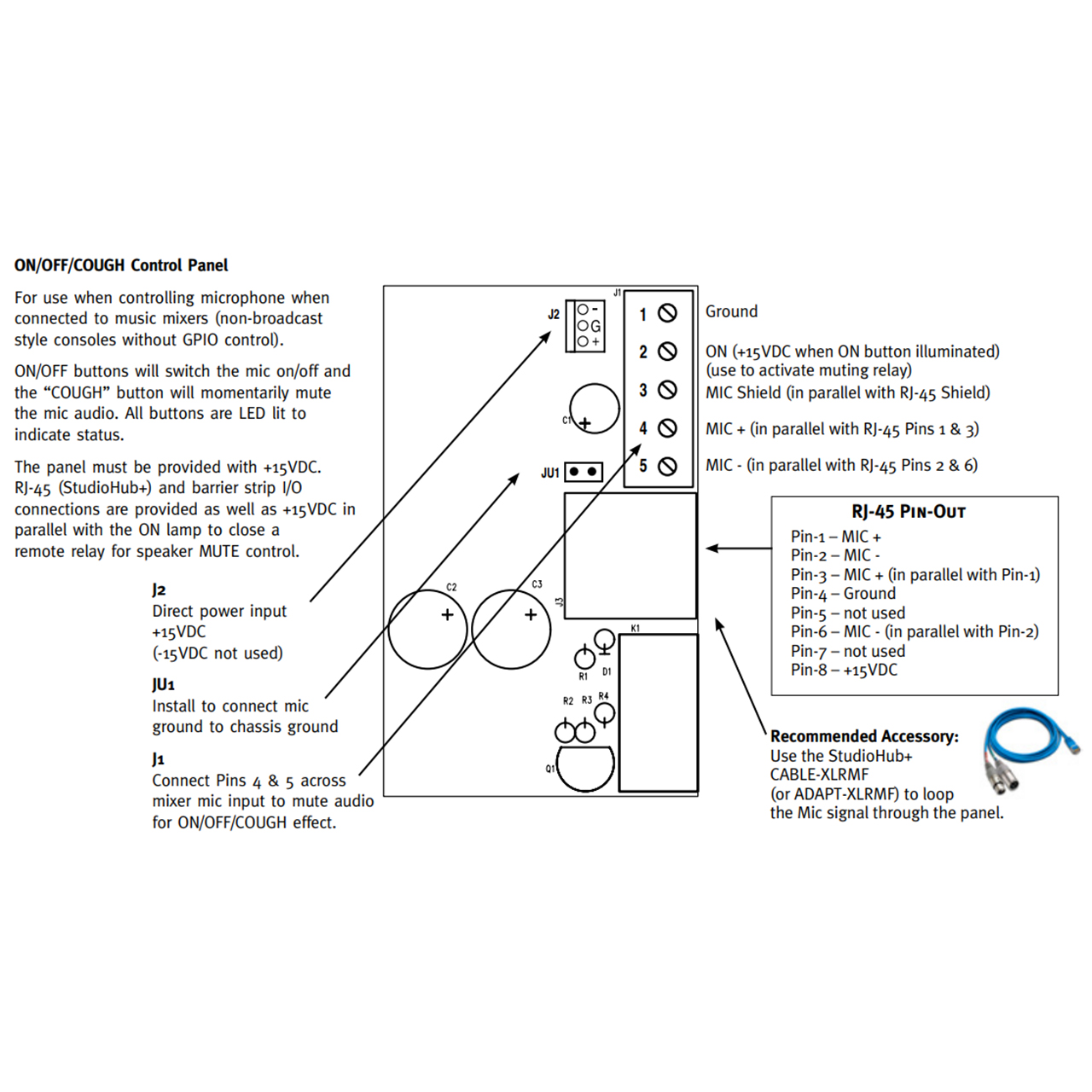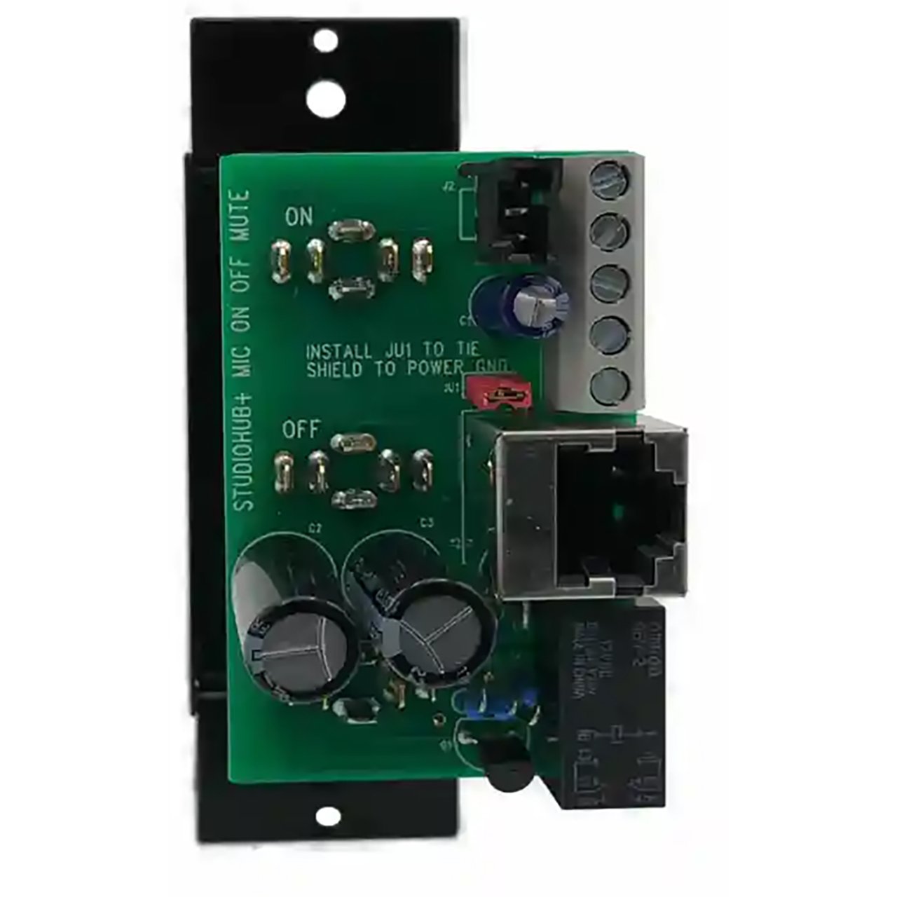 The panel must be provided with +15VDC. RJ-45 (StudioHub+) and barrier strip I/O connections are provided as well as +15VDC in parallel with the ON lamp to close a remote relay for speaker MUTE control.
