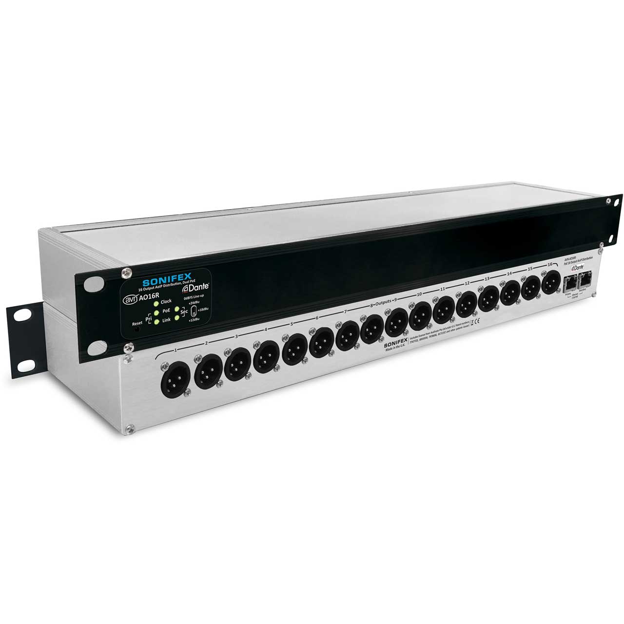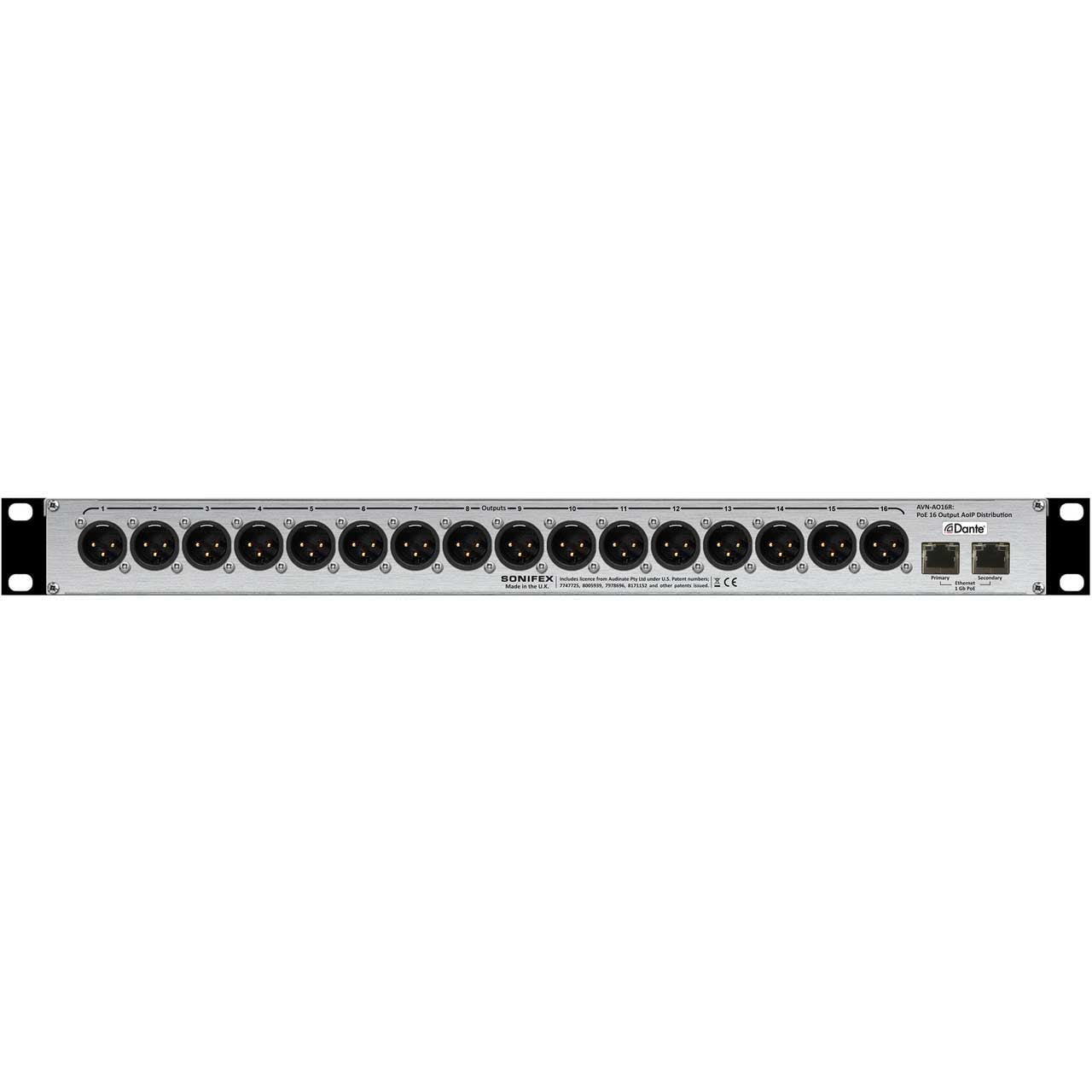 The Sonifex AVN-AO16R audio converter and interface converts up to sixteen analog outputs from the Dante Audio-over-IP networking standard. Dual Ethernet ports allow the unit to operate in redundant mode, ensuring audio routing is maintained in the event of loss of link on either of the network connections.