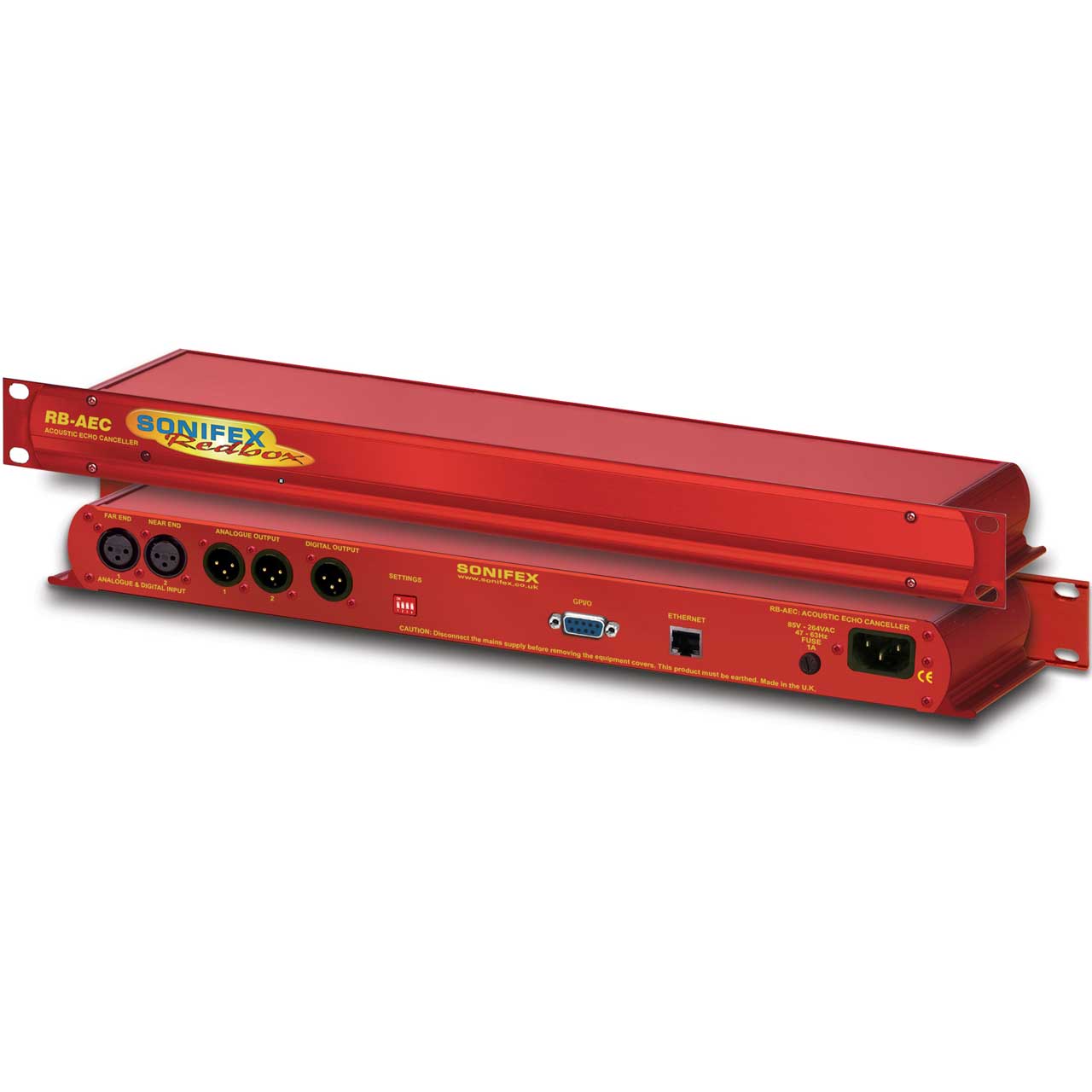 The RB-AEC 1U rack-mount is an acoustic echo canceller primarily designed for the benefit of studio personnel for television and radio. When a studio presenter's microphone signal is played out through a monitor speaker in the control room, it can be picked up by the control room microphone(s) and returned to the presenter's earpiece as an undesirable echo.