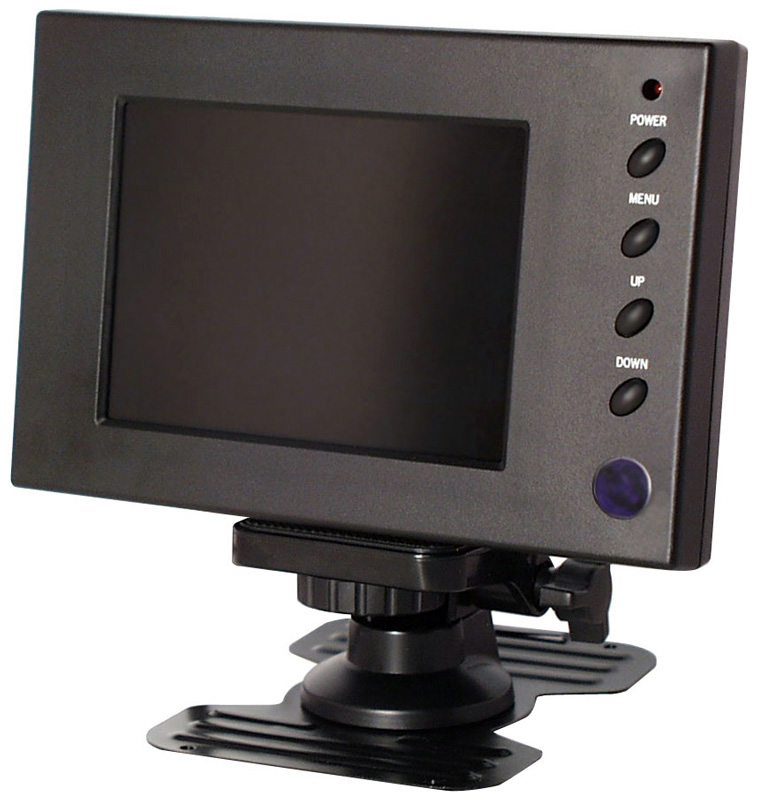 Our 5 inch high resolution TFT flat screen LCD monitor offers convenient on screen display controls located on the front panel. It includes controls for brightness, contrast, hue, color, vertical and horizontal positioning, and volume. It features audio with front mounted speakers. An input signal detection provides for easy connection. A 12V DC power supply and A/V cable are included.