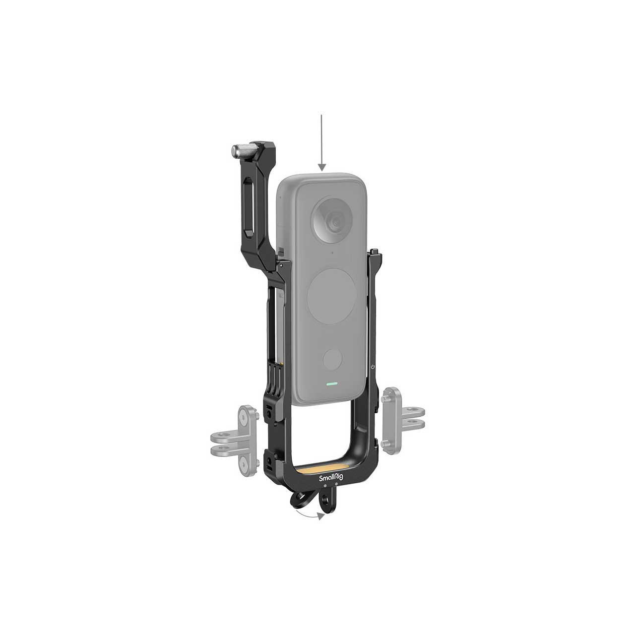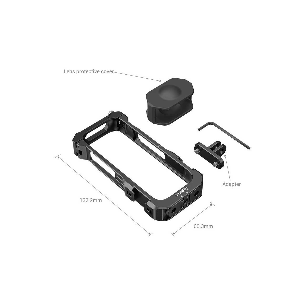 The lightweight aluminum utility frame from SmallRig 2923 provides accessory mounting options and protection for your Insta360 ONE X2 camera. The camera mounts onto the frame from the top, securely locked by an easy-to-grasp knurled screw, and it incorporates soft pads to protect the camera from scratching. It maintains full access to the camera's controls and features a variety of mounting options. In addition to the integrated cold shoes on each side for accessories like small mics, the frame also features mounting fingers and a 1/4"-20 thread for attaching the camera to tripods or other three-prong mounts. The silicone lens cap in the package protects your lens against bumps & scratches.