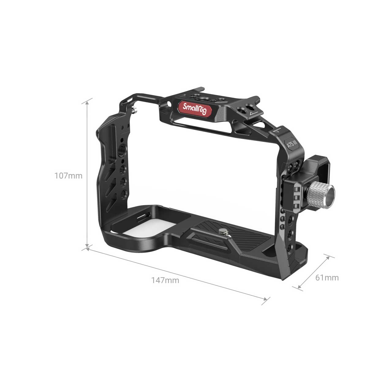 SmallRig Standard Camera Cage Kit for Sony Alpha 7S III 3180 locks the camera firmly via one 1/4”-20 screw on the bottom and one M2.5 screw on the side. The M2.5 screw needs to pass through the shoulder strap holes on the side of the camera. The cage 3065 features multiple standard mounting points and gives you full access to all the ports, bottoms, and the battery door of the camera. In addition to multiple 1/4"-20, 3/8"-16 threaded holes and shoulder strap holes, the cage also comes with standard NATO rails and cold shoe mounts. You can mount accessories on the cage such as SmallRig Monitor Mount 2904, microphones, SmallRig Side Handle 2187 and HSN2093, etc. In order to prevent the camera's HDMI cable from accidental disconnection, the cage is equipped with an HDMI cable clamp, which can be attached to the side of the cage via a 1/4"-20 thumbscrew, and the locking part is adjustable. The cage is made of magnesium-aluminum alloy material, which reduces 40% weight than a traditional cage. Moreover, there is a magnetic screwdriver on the bottom of the cage for your assembly.