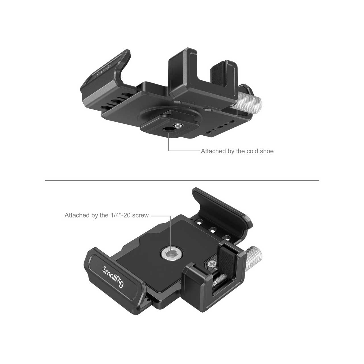 SmallRig T5/T7 SSD Mount for BMPCC 6K PRO 3272 is Samsung T5/T7 SSD compatible and works with the BMPCC 6K PRO cage 3270. It secures to the cold shoe on the top left of the cage and fixes the SSD via extendable spring-loaded clamps on both sides. It comes with a locating bead structure and a built-in 1/4"-20 threaded hole so that you can either attach it to a cold shoe or use a spare screw for mounting. Its internal all-round rubber pads can securely hold the SSD and prevent scratching. It also provides a USB-C cable clamp fixable with a thumb screw. The mount serves as a sound solution for a BMPCC 6K PRO camera using SSD.