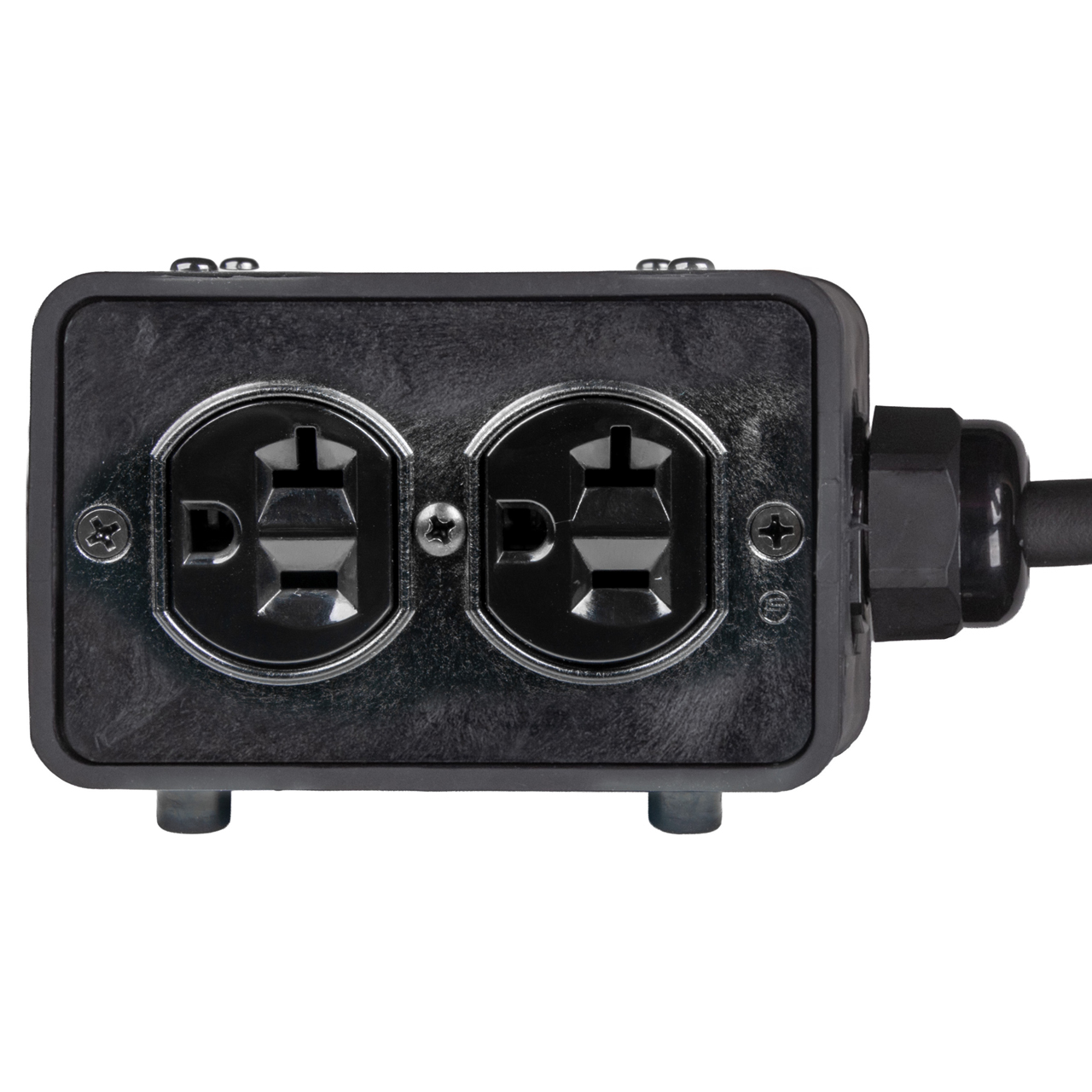The Leviton Two-Gang Portable Electrical Outlet Box is a great solution for treating portable power pendants and stringers for temporary power applications. It is extremely resistant to heat and harsh chemicals and the adjustable strain relief provides protection for the PWR-12/3-TP power cable.