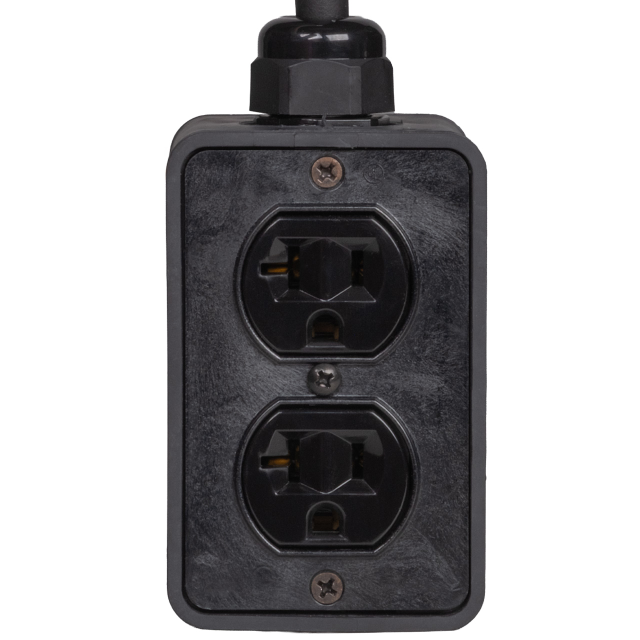 The Leviton Two-Gang Portable Electrical Outlet Box is a great solution for treating portable power pendants and stringers for temporary power applications. It is extremely resistant to heat and harsh chemicals and the adjustable strain relief provides protection for the PWR-12/3-TP power cable.