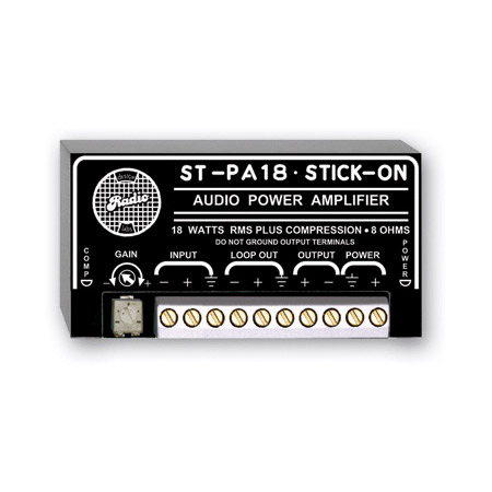 The RDL ST-PA18 features a balanced line level input that may be connected unbalanced. The gain control range will accommodate standard unbalanced levels as well as professional balanced levels. The module bridges the input signal. LOOP OUT terminals permit a balanced input to be fed to additional amplifier modules making the ST-PA18 an ideal component in distributed audio system design. The LOOP OUT may also be used to feed a subwoofer amplifier (see RDL ST-CX2S Subwoofer Filter).