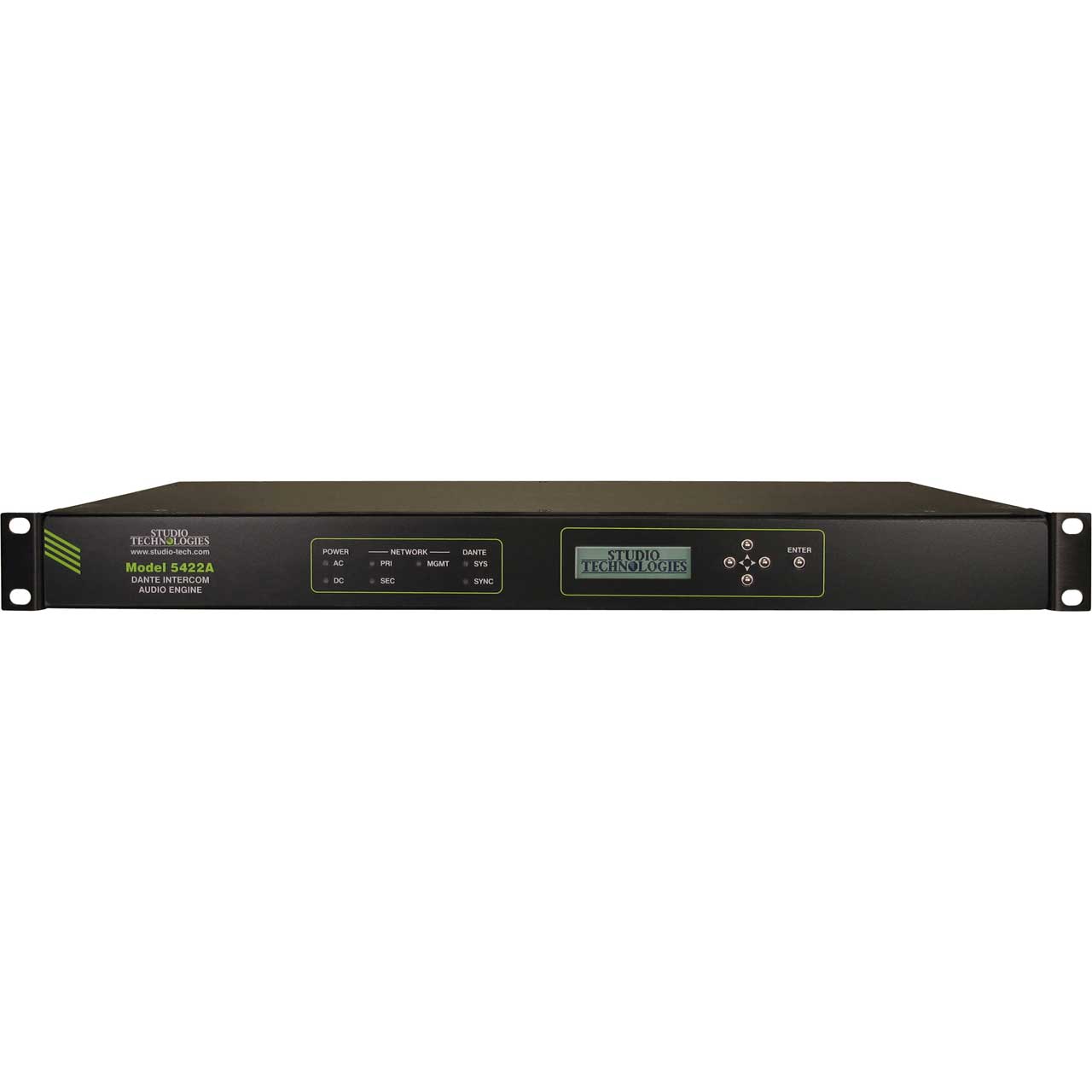 The Model 5422A provides three Gigabit Ethernet ("GigE") network interfaces, two which can support redundant Dante operation and a third for accessing the management menu system. To meet the latest interoperability standard the unit's Dante implementation meets the requirements of AES67. Support for the Dante Domain ManagerT (DDM) software application is also provided. An integral web server allows fast and flexible configuration of the unit's audio, networking, and Dante performance. Front-panel indicators, a graphics display, and pushbutton switches provide personnel with direct access to key operating parameters. The Model 5422A can be powered by 100-240 V, 50/60 Hz mains or a source of 12 volts DC. The lightweight enclosure mounts in one space (1U) of a standard 19-inch rack.