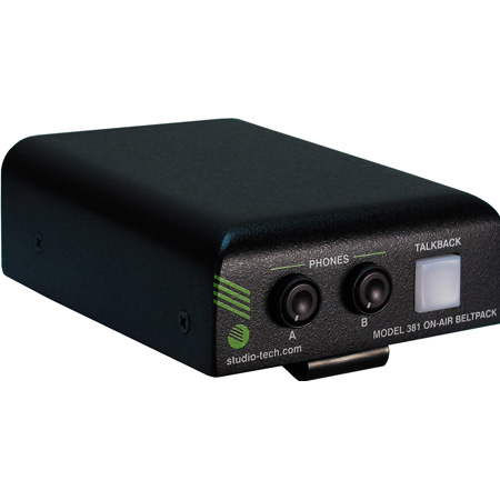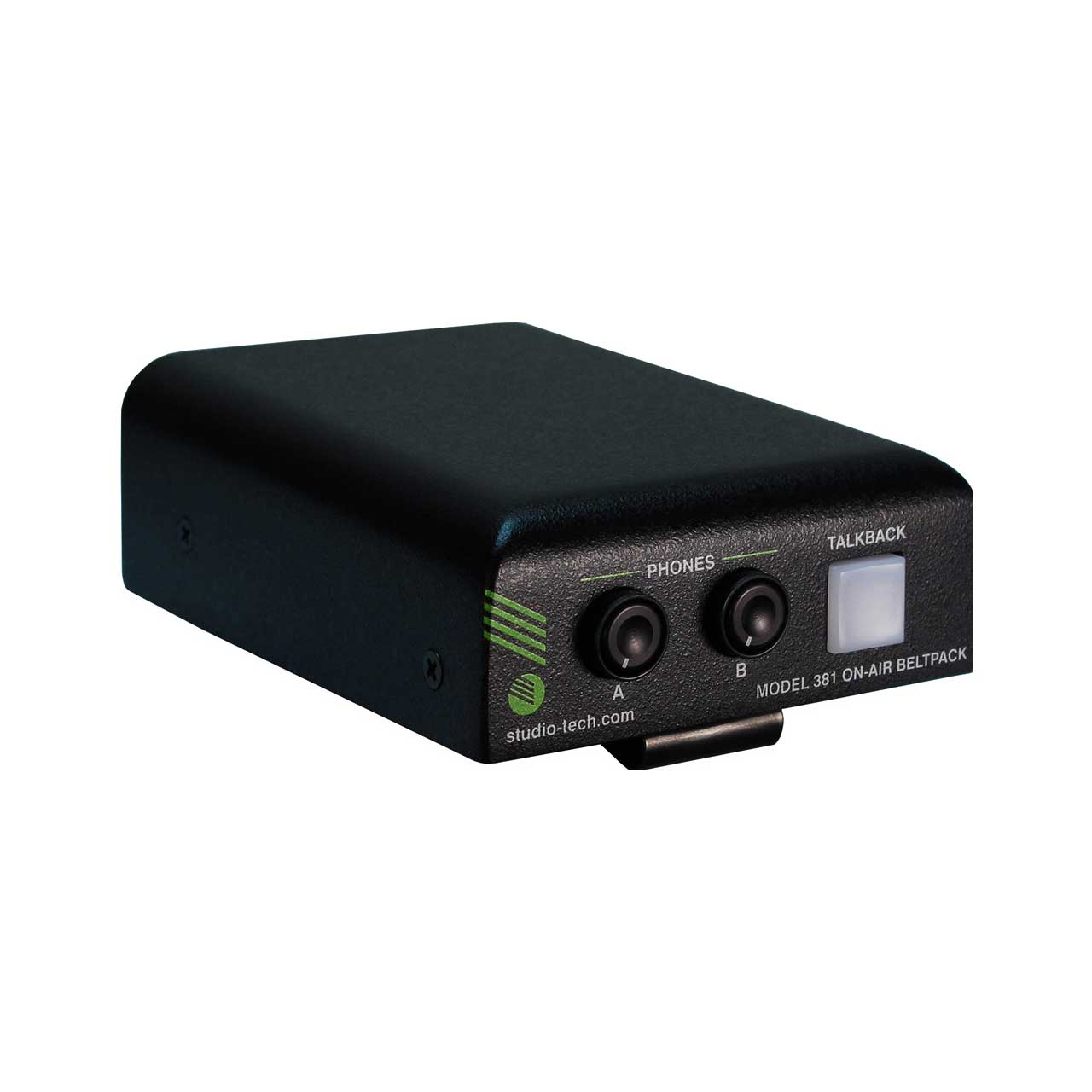 The Studio Technologies Model 381 On-Air Beltpack offers a unique combination of audio resources to directly support a complete broadcast "stand-up" on-air position. Using Dante® audio-over-Ethernet technology, the unit provides main and talkback output channels, talent cue (IFB) input, and sidetone capabilities, as well as essential user controls in a compact, portable package. The Model 381 is compatible with the Dante Domain Manager™ (DDM) software application and is AES67-compliant for direct integration into many contemporary networked audio applications.