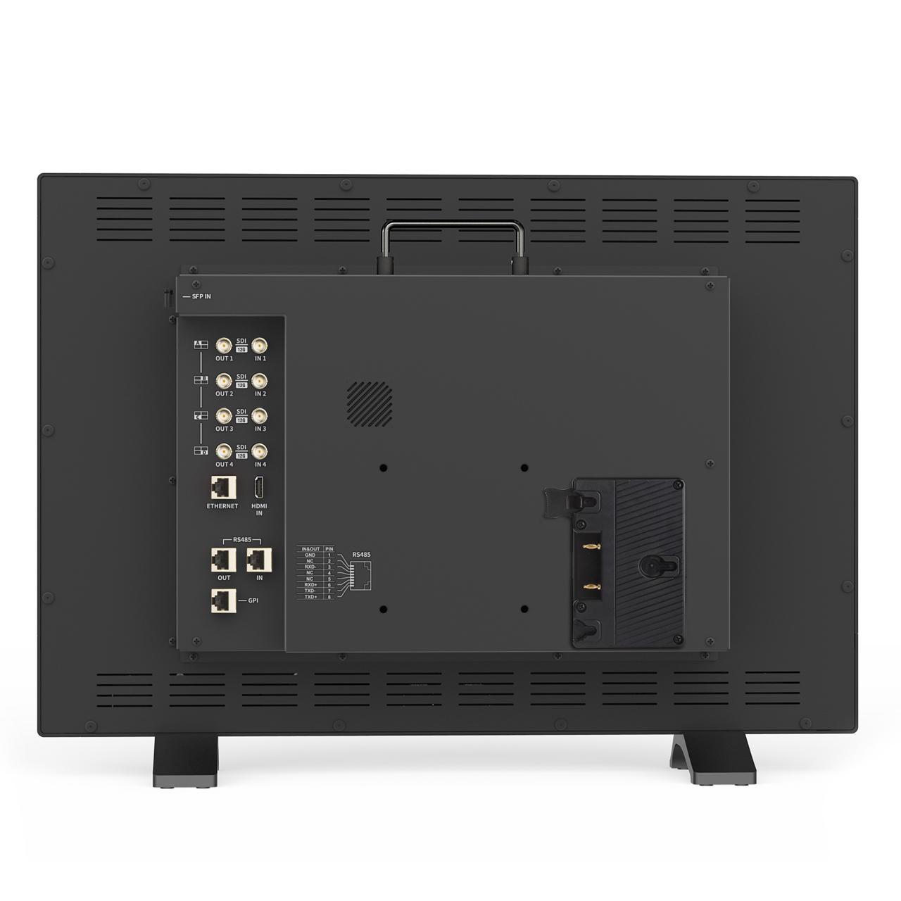 The monitor has built-in multi camera logs to HLG1000, PQ1000, Rec 709 SDR conversion LUTs, including Log-C, C-log, S-log2, S-log3, V-log, J-log1, RedLogFilm etc. The User 3DLUTs can be uploded to monitor via USB port support 17x17x17 3DLUT cube files. BM-U245HDR monitors features multi video analysis patterns, such as Waveform/Vector/Histogram/Focus Assist/False Color/Zebra. The monitor supports IP remote control via LAN(RJ45) connection, using PC to remote control monitor settings. BM-U245HDR consumes 120W power, supports both AC 100V - 240V input, 4-pin XLR DC 12V - 17V input, and a Gold mount battery plate on the rear panel.
