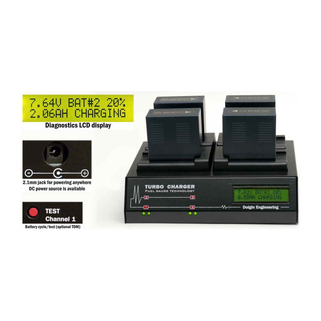 TheTC400-SON-FZ100-TDM fast four position simultaneous battery charger with diagnostics display accepts Sony NP-FZ100 batteries. This unit has a built-In test/discharge module and is compatible with Non-OEM batteries.