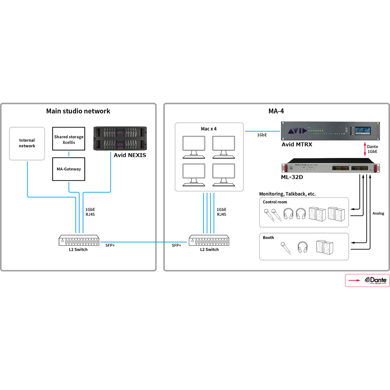 A powerful and flexible solution, the TASCAM ML-32D has 4 D-Sub inputs and 4 D-Sub outputs, which can easily be connected to any of the many devices that utilize D-Sub connectors such as microphone preamplifiers, large and small format console mixers, audio interfaces, amplifiers, and euro block connector devices. This simple, yet elegant, solution enables audio to be quickly and easily inserted into - or extracted from - the Dante audio stream.