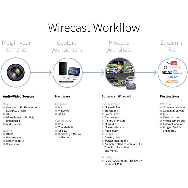 The WC8STU is all-in-one live video streaming software that enables unlimited capture, live production, and encoding of HD and SD sources for live streams broadcast to multiple servers and platforms simultaneously. Includes a FREE copy of NewBlueFX Titler Live Express (a $149 value).