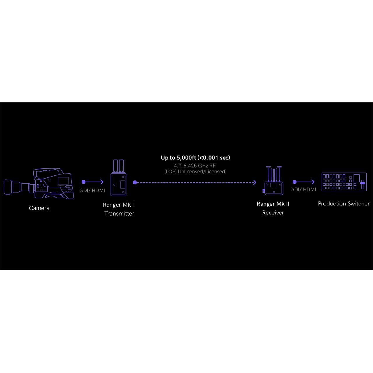 The Teradek Ranger Mk II 5000 can wirelessly transmit 12G-SDI/HDMI video signals up to 5000 feet (1524 meters) line of sight, the maximum transmission distance for systems in the Ranger Series, and works seamlessly within a variety of professional broadcast, sports, and ENG applications, including hand-held gimbals, drones, and shoulder-mounted production cameras.