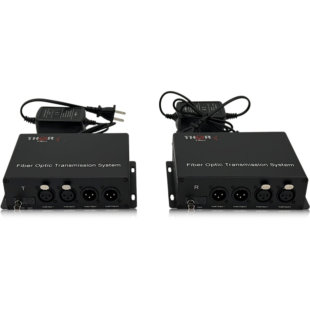 The Thor Fiber F-2A-XLR-B-TXRX XLR audio over fiber units are able to send balanced audio over fiber much further than traditional copper. Their Audio Interface with XLR kit has both a transmitter and receiver unit. Available options are for 2, 4, 8, 16 or 32 XLR inputs/outputs can be used on a single transmitter unit and sent over fiber to the receiver unit that also has an equal number of XLR outputs. The fiber allows the signal to be sent over a long distance without losing any quality in the signal. The kit is 16-bit digitally encoded broadcast quality balanced audio over one multi-mode or single-mode optical fiber. Thor XLR Audio Splitters are typically used in applications for Rental, Staging, Concerts, Theater, Churches, Stadiums, Theme Parks, Broadcast/Studio, Intercom, CCTV audio and Professional AV applications. Popular devices to use in conjunction with the XLR transmitter and receiver are: XLR Audio Mixers, Digital Audio Recorders with XLR IN/OUT and Audio signal Splitter with XLR. They are available for stand-alone or rack-mount installations. Their standard fiber connectors are ST/PC, but it could also be ordered as SC/PC or FC/PC. Basic units support up to 20Km of single mode / 3000 multimode fiber, other modes are available - 40km, 80km, 120km.