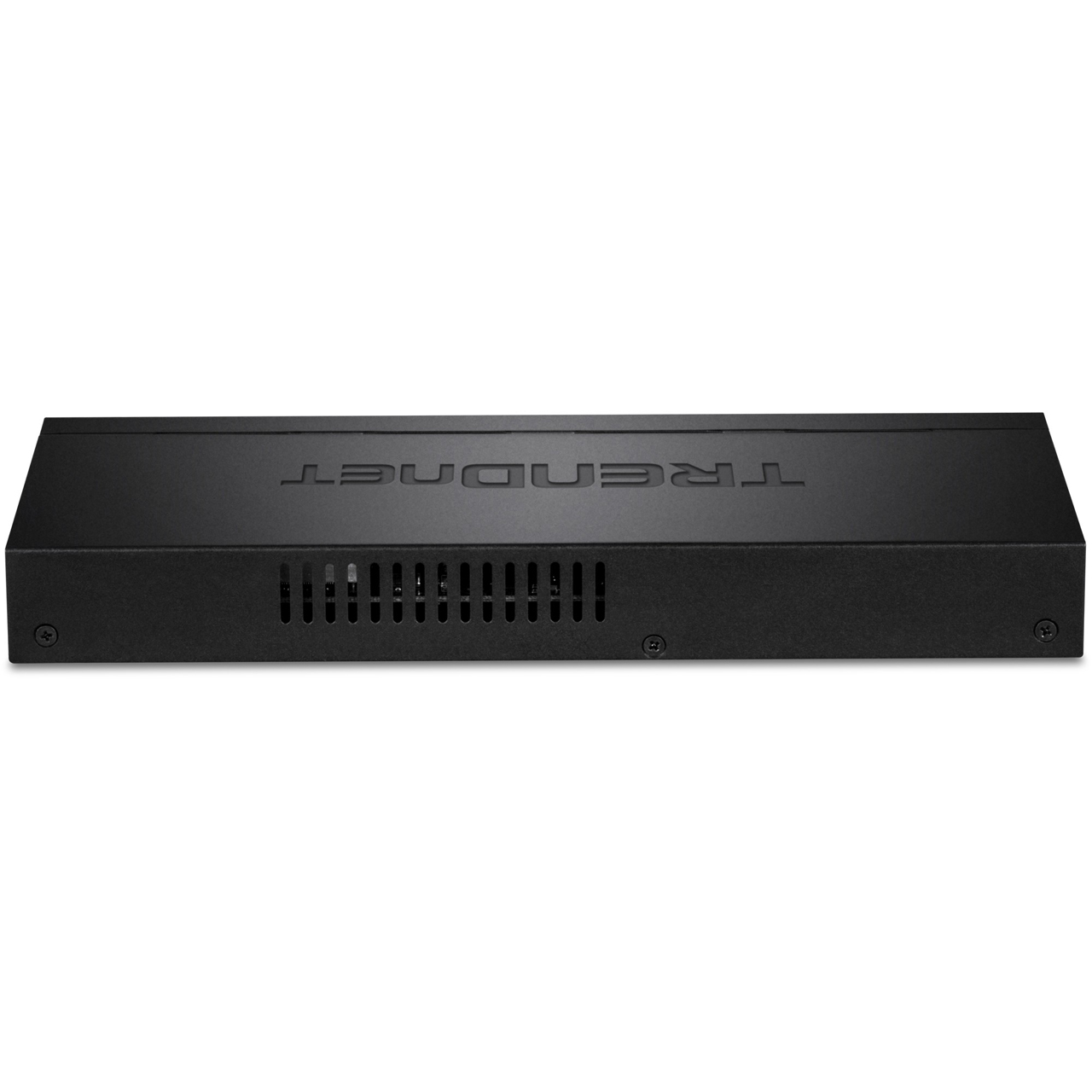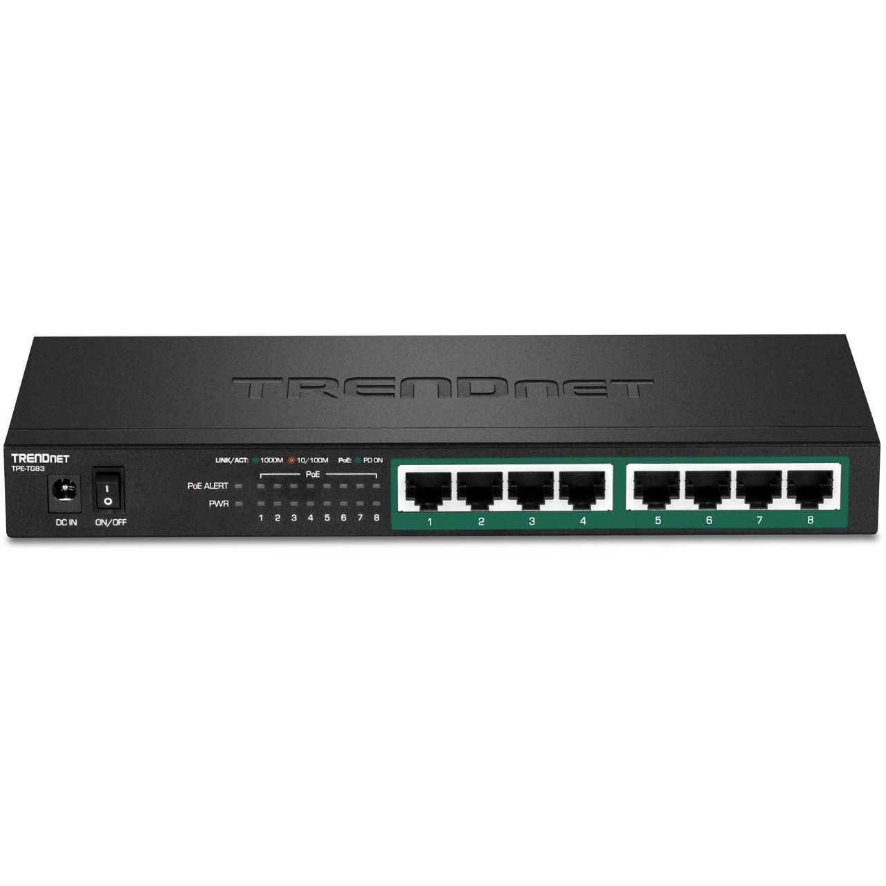 The TRENDnet 8-Port Gigabit PoE+ Switch, model TPE-TG83, reduces equipment and installation costs by delivering data and power over existing Ethernet cables. With PoE technology, users only need one set of cables to deliver both data and power. This compact network switch provides eight gigabit PoE+ ports with a total PoE power budget of 65W. The TPE-TG83 PoE+ switch allows you to network PoE devices, such as wireless access points, IP cameras, VoIP phones, IP video encoders, access controls, and more. It features a fanless design, and has a convenient option for wall mounting.