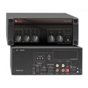 Features include five inputs, two auxiliary (stereo summing) line inputs. two balanced microphone inputs and one telephone input. Mic 1 input provides 21V DC phantom power (switchable ON/OFF). Speaker outputs consist of 70.7 V, 25 V and 4 ohm. An auxiliary line output can be used for recording or connection to an external power amplifier.