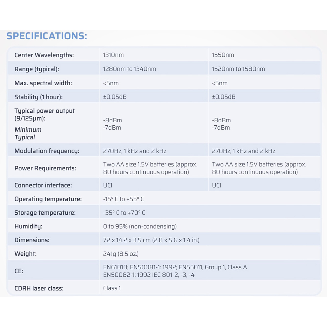 The EMI fiberTOOLS series consist of the 560XL-EMI (Optical Power Meter), 570XL-EMI (LED Source), and 580XL-EMI (Dual Laser Source) all sold separately. The optical and mechanical performance is equivalent to the non-EMI versions and can be used to measure absolute optical power and perform loss testing on singlemode and multimode fiber links. The EMI designation allows the capability of performing these measurements in harsh EMI conditions to MIL-STD-461E. The 570XL-AS100-EMI meets the stringent AS-100 launch condition.
