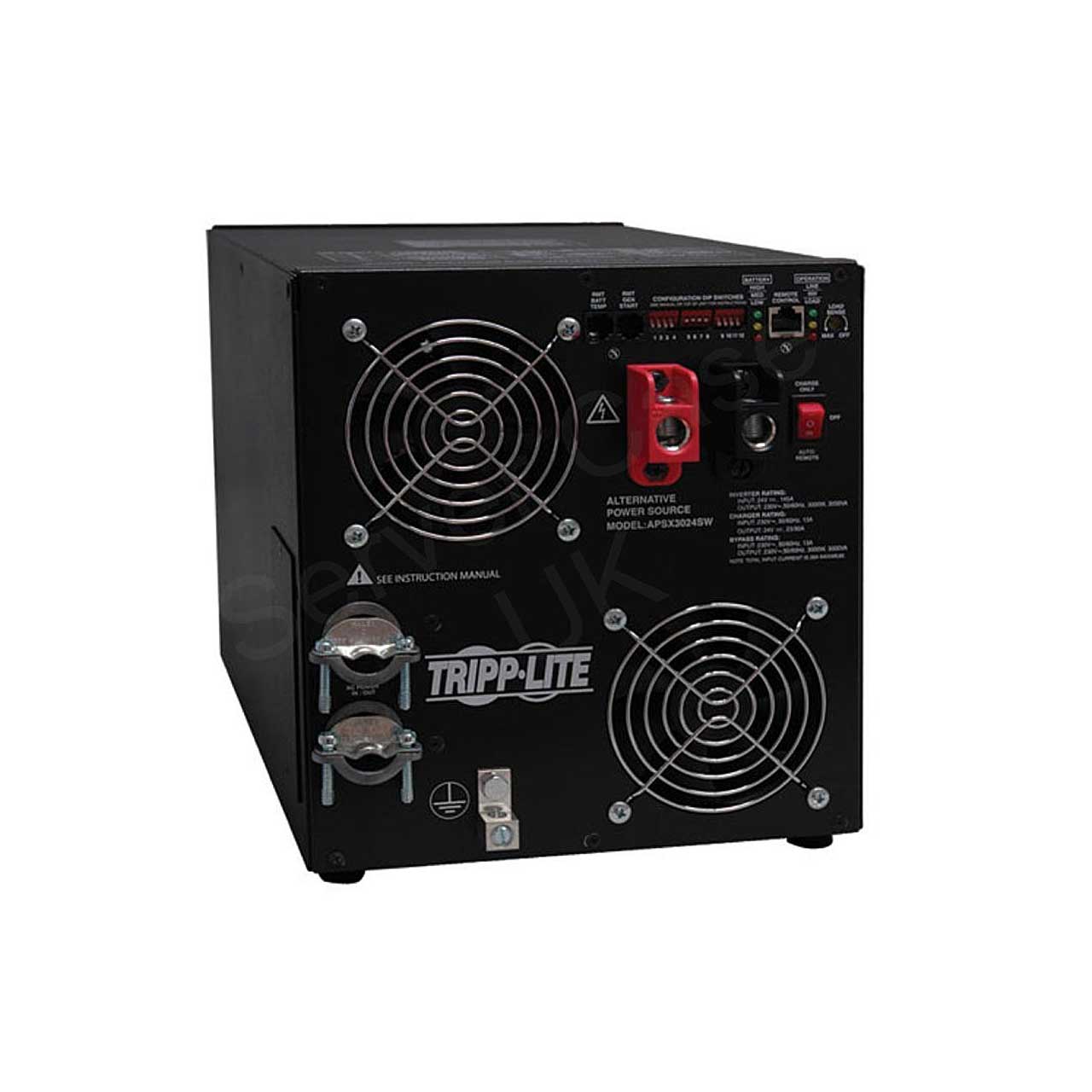 Tripp Lite's APSX3024SW DC-to-AC inverter with automatic line-to-battery transfer and integrated charging system serves as an extended run UPS, a standalone power source or an automotive inverter. Supplies up to 3000 watts of continuous 230V sine wave AC power from any 24V battery or automotive DC source. When hardwire AC input is energized, commercial power passes through to connected equipment and the battery set is recharged via 3 stage, 23/90 amp charging system. In UPS mode, the APS system responds to blackouts and severe voltage fluctuations with a near instantaneous automatic transfer to battery-derived AC output. Includes a set of high current DC input terminals for simple installation (user supplies batteries and cabling - see owner's manual for recommendations). Passes sine wave utility or generator power during battery charging and UPS line power operation, and sine wave AC output in inverter and UPS backup modes. Built-in Automatic Voltage Regulation (AVR) corrects line power AC brownouts and overvoltages without using battery power during battery charging and UPS standby modes. Reliable large transformer design, with frequency control powers resistive electronic loads or large inductive motors, compressors and other items with high current needs on startup. Optional APSRM4 wired remote power switch with full status LEDs provides remote power inverter on/off switching and continuous status information (part# APSRM4 sold separately). Supports an unlimited amount of runtime with any number of user-supplied batteries connected. Highly adaptable to a variety of applications and site conditions with adjustable charger settings for wet/gel battery types and selectable line to battery power transfer voltages.