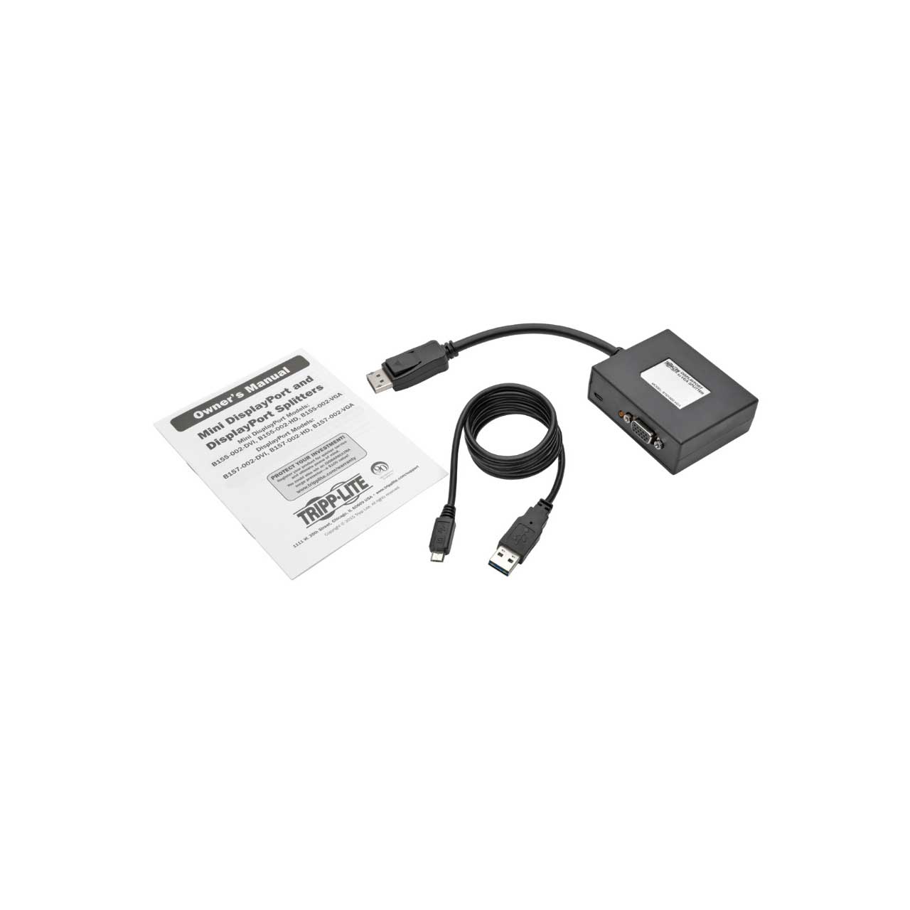The B157-002-VGA 2-Port DisplayPort to VGA Splitter converts and splits a DisplayPort video signal for display on two VGA-enabled monitors, projectors or televisions at the same time. Ideal for offices, conference rooms, retail settings, trade shows and classrooms, this compact splitter features a built-in DisplayPort cable that connects to the source. It lets you use your existing VGA displays instead of buying new DisplayPort monitors or docking stations.