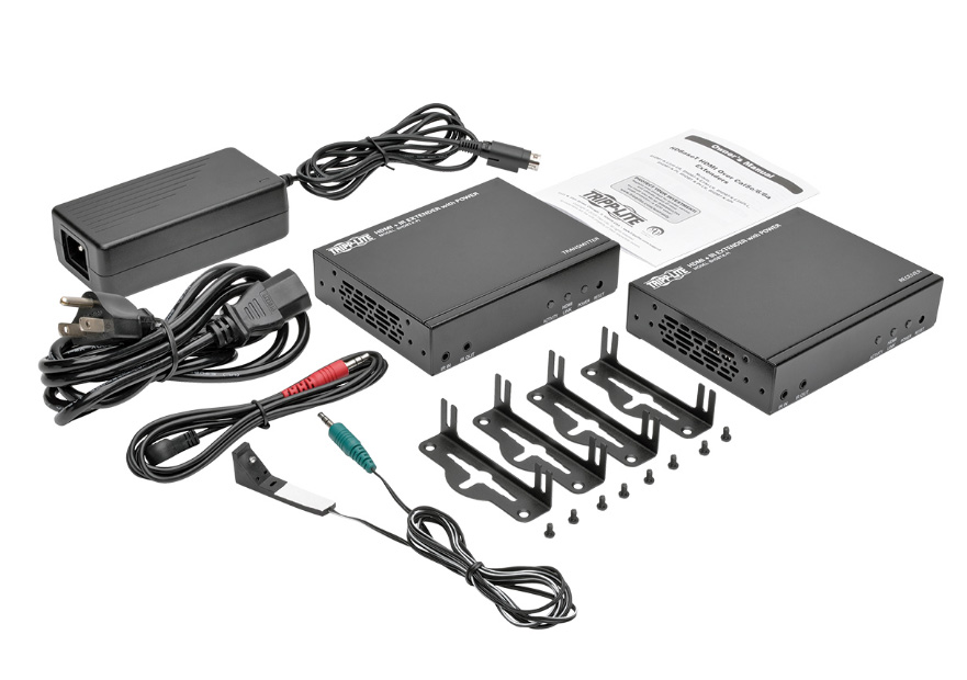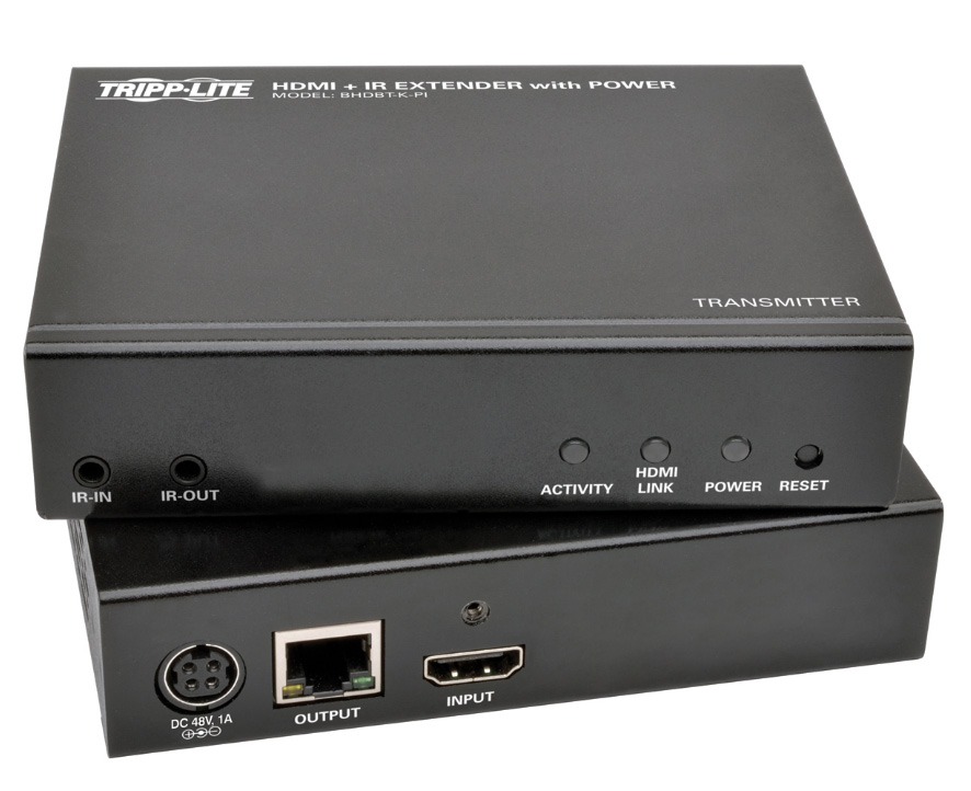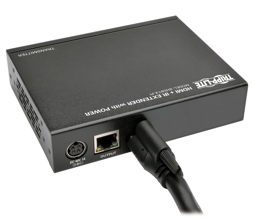 In addition to HDMI and IR signals, this extender kit features built-in PoE technology, which powers the receiver over Cat5e/6/6a cable, eliminating the need for an external power source. The two-way IR remote control feature (@ 39 KHz) lets you control your Blu-ray player or other HDMI source using its remote when at the remote monitor or control your remote monitor using its remote when at the Blu-ray player. Locking HDMI ports (ideal for use with Tripp Lite’s P569-006-LOCK high-speed HDMI cables with locking connectors) on both the transmitter and receiver prevent cables from coming loose or undone, ensuring an intact signal. The plug-and-play BHDBT-K-PI supports 7.1-channel surround sound, DTS-HD and Dolby TrueHD audio, as well as 3D video, EDID and HDCP. Attach the transmitter and receiver units to a wall, rack or pole with the included mounting hardware.