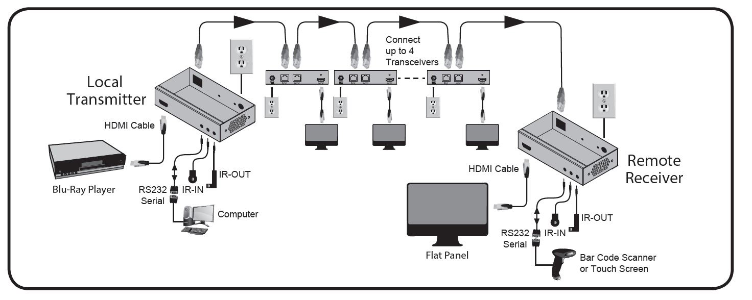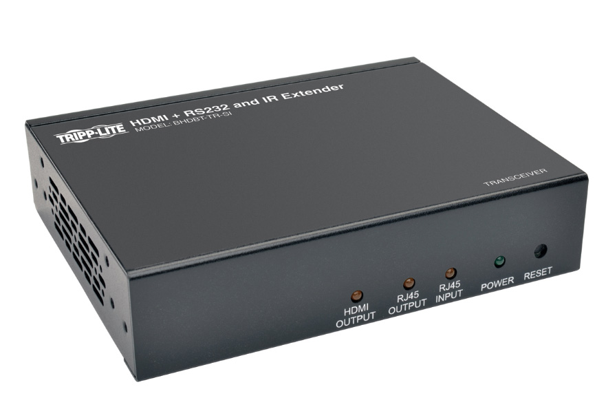 Insert the BHDBT-TR-SI HDBaseT Class B (HDBaseT-Lite) HDMI over Cat5e/6/6a Extender Transceiver between the transmitter and receiver units in your Tripp Lite HDBaseT Class B installation to extend the range of your signal. Connect its HDMI port to a projector, monitor or television to expand your installation. Using a single Cat5e/6/6a cable, the BHDBT-TR-SI transmits uncompressed HDMI audio and video, RS-232 serial and IR control signals up to 230 feet (70 m) from the previous unit in the chain (either the transmitter or another transceiver), including a 1920 x 1080 (1080p) signal @ 60 Hz. It can also extend an Ultra High Definition (UHD) 3840 x 2160 (4K x 2K) video signal up to 130 feet (40 m) from the previous unit in the chain. Add up to five BHDBT-TR-SI Extender Transceivers to the chain for a total range up to 780 feet (4K x 2K) or 1,380 feet (1080p) with a monitor connected to each transceiver.