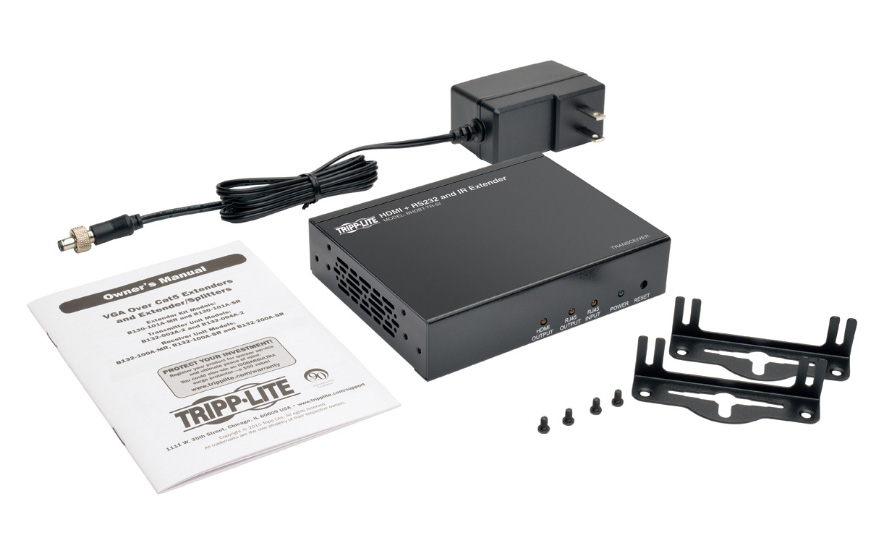 RS-232 serial signals and IR remote control signals (@ 39 KHz) also pass through the transceiver, so your HDBaseT installation can control such RS-232 devices as scanners and touchscreen displays at baud rates up to 115 Kbps. You can also operate a Blu-ray player using its remote when at the remote monitor and vice versa. Locking HDMI ports (ideal for use with Tripp Lite’s P569-006-LOCK High-Speed HDMI cables with locking connectors) prevent cables from coming loose or undone, ensuring an intact signal. Attach the BHDBT-TR-SI to a wall, rack or pole using the included hardware.