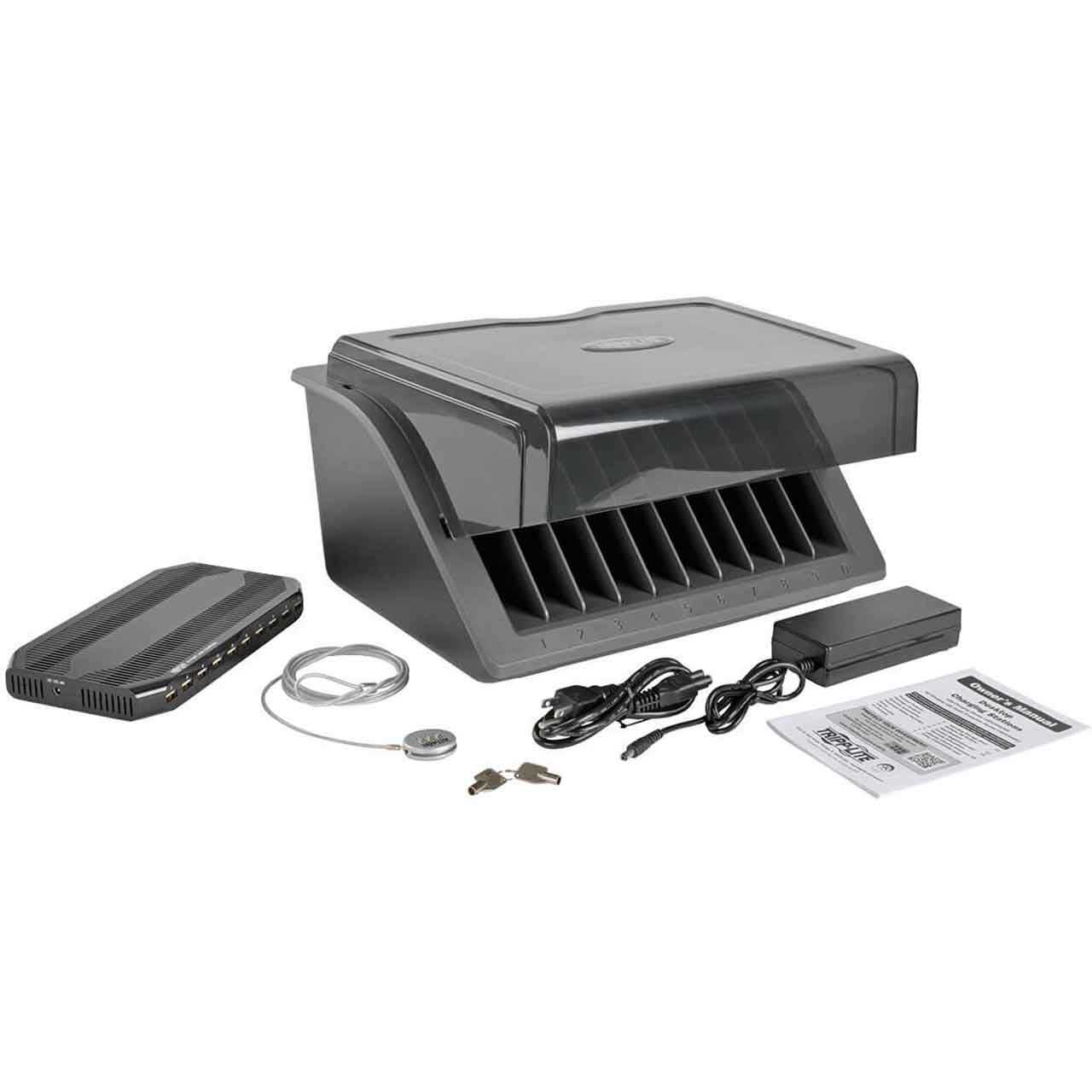 The Tripp Lite CSD1006USB 10-Device Desktop USB Charging Station provides USB charging, secure storage and cord management for up to 10 tablets, iPads and e-readers up to 10.5 inches. It's recommended for schools, offices, warehouses, retail outlets, worksites, healthcare facilities and anywhere else multiple mobile devices are used.