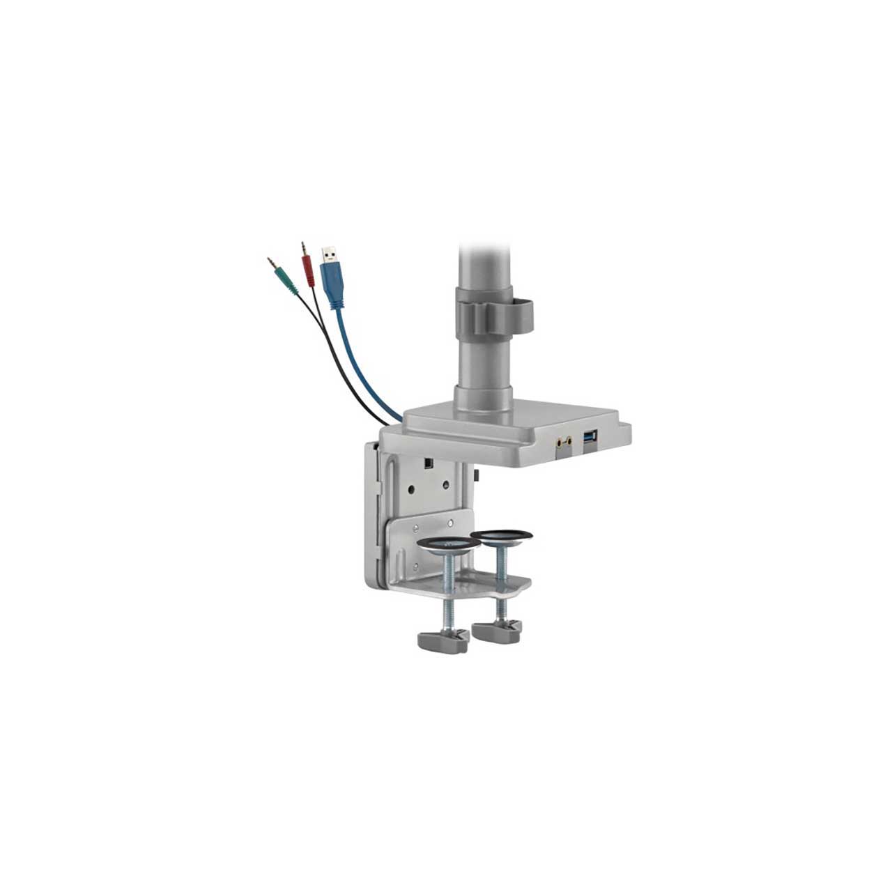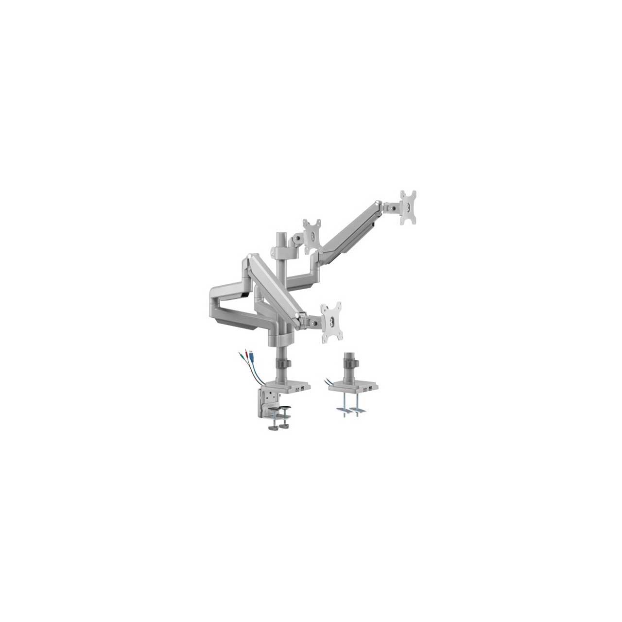 This VESA-compliant desktop clamp mounts three flat-screen displays above your desk, table or workstation, allowing you to free up valuable surface space. Recommended for home or office use, the Tripp Lite DDR1730TAL fits most flat-panel monitors from 17 to 30 inches. The durable aluminum frame tolerates frequent adjustments, and the two swiveling aluminum arms support up to 15.4 pounds apiece. Instead of clamping the unit to your desktop, you may install it using the included grommet. All hardware is included. Cable management brackets along the arms prevent excess cord clutter.
