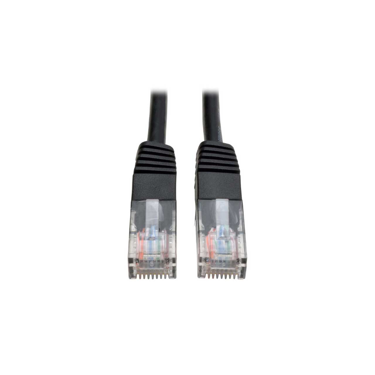 Tripp Lite's 10-foot black category 5e (Cat5e) patch cable has 2 standard RJ45 molded male connectors featuring integral strain relief. The cable is manufactured from PVC 4-pair stranded UTP and is rated for 350MHz/1Gbps communication. All cables are offered in a variety of lengths and colors for all category 5 (Cat5) and 5e cabling needs. Snagless category 5e patch cables are also available.