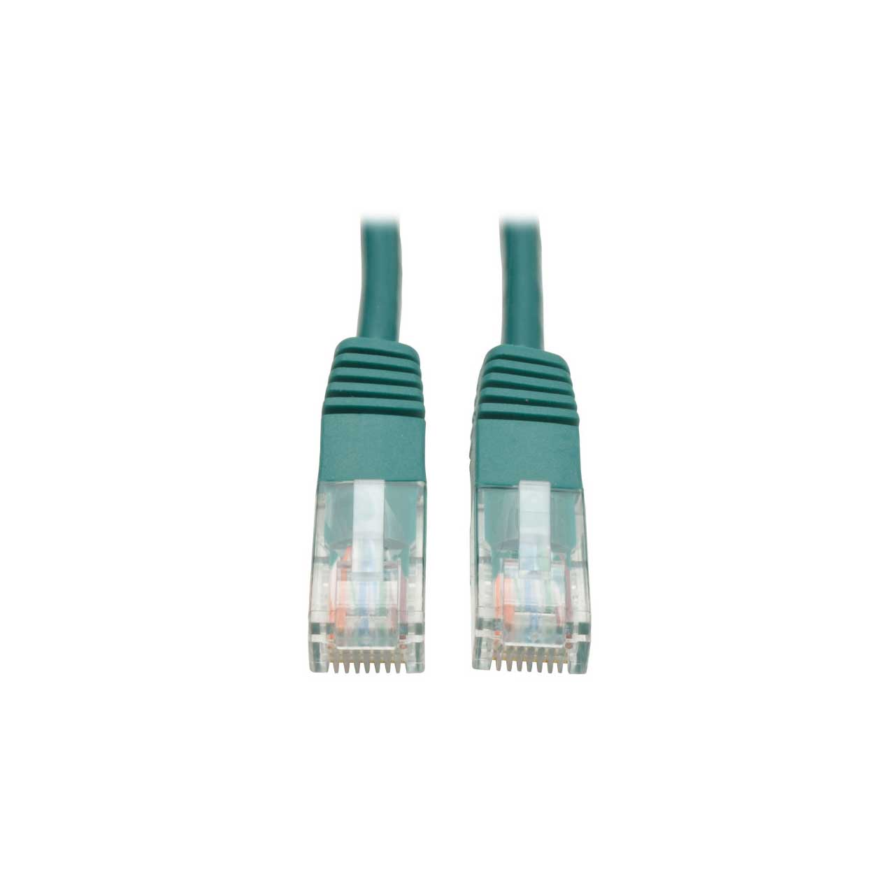 Tripp Lite's 10-foot green category 5e (Cat5e) patch cable has 2 standard RJ45 molded male connectors featuring integral strain relief. The cable is manufactured from PVC 4-pair stranded UTP and is rated for 350MHz/1Gbps communication. All cables are offered in a variety of lengths and colors for all category 5 (Cat5) and 5e cabling needs. Snagless category 5e patch cables are also available.