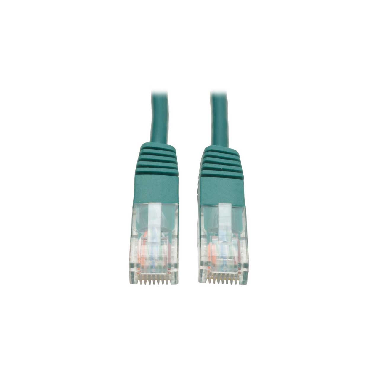 Tripp Lite's 15-foot Green category 5e (Cat5e) patch cable has 2 standard RJ45 molded male connectors featuring integral strain relief. The cable is manufactured from PVC 4-pair stranded UTP and is rated for 350MHz/1Gbps communication. All cables are offered in a variety of lengths and colors for all category 5 (Cat5) and 5e cabling needs. Snagless category 5e patch cables are also available (N001-Series).