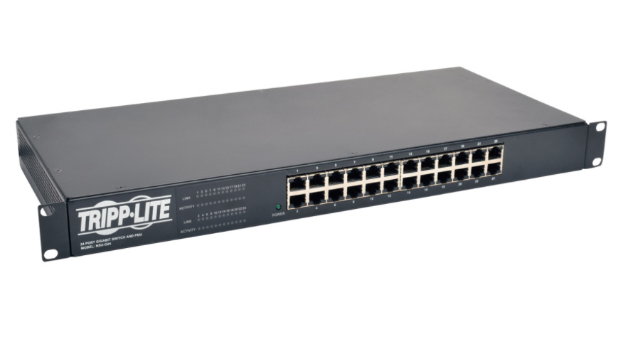 Tripp Lite's NSU-G24 combines a 1.44kW single-phase 120V Basic Power Distribution Unit (PDU) with an Unmanaged 24-Port Gigabit Ethernet Switch for an all-in-one 1U rack-mount solution. It is perfect for racks in smaller, distributed networks where space is at a premium by providing both power and Ethernet connectivity in only 1U of rack space. The power distribution unit supplies continuous AC power from a connected UPS system or alternate source and contains 12 NEMA 5-15R outlets allowing you to power critical IT equipment.