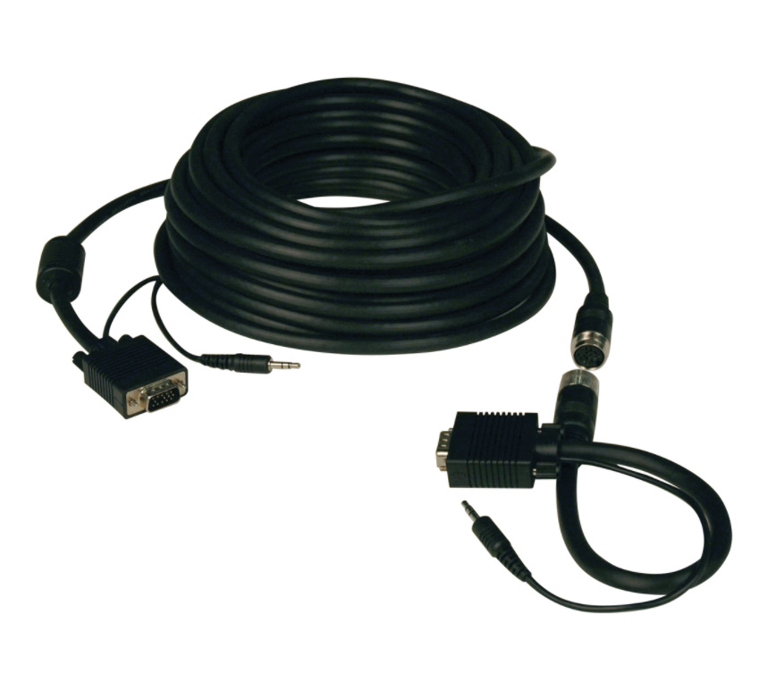 Tripp Lite's 100 ft. SVGA/VGA Easy Pull Monitor Cable with Connectors and built-in 3.5mm Audio makes running long length video cables a snap. The pull-apart design allows the cable to be run through conduit or other tight areas that a HD15 connector wouldn't fit through. Diameter of the circular DIN end is only 7/8". Circular Easy Pull connector is threaded to ensure maximum security once the cable is re-attached. The mini-coax (RGB) and paired video wire construction delivers superior signal quality. Double shielding (foil and braid) provides maximum EMI/RFI protection. Both high density DB15 males and 3.5mm stereo connectors are molded and have integral strain relief to ensure they last a long time.
